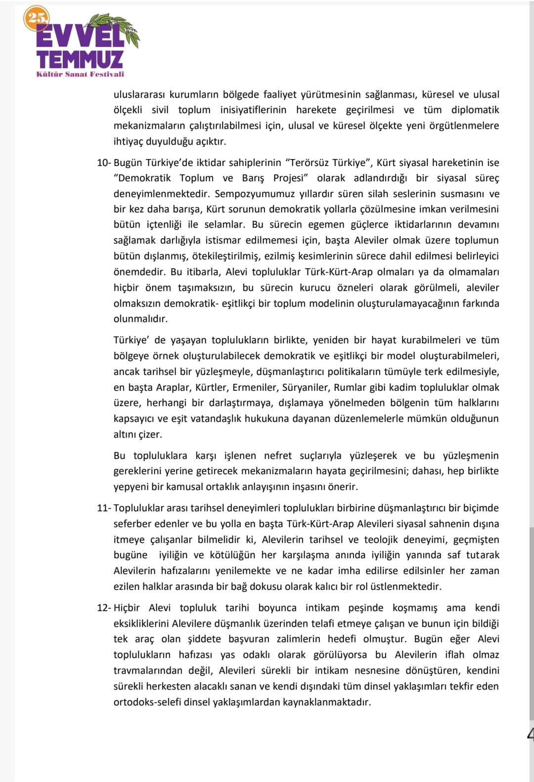 Türk, Kürt ve Arap Aleviler arasında ortak çatı örgütlenmesinin kurulmasının kaçınılmaz olduğu belirtilen bildirgede, bu yapılanmanın yalnızca bölgesel değil küresel bir dayanışma modeli inşa etmesi gerektiği dile getirildi.