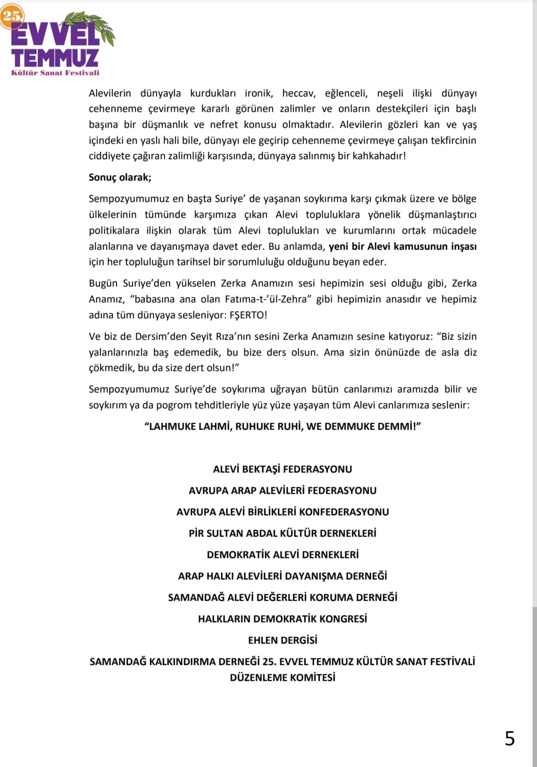 Alevi Bektaşi Federasyonu, Avrupa Arap Alevileri Federasyonu, Avrupa Alevi Birlikleri Konfederasyonu, Pir Sultan Abdal Kültür Dernekleri, Demokratik Alevi Dernekleri, Arap Halkı Alevileri Dayanışma Derneği, Samandağ Alevi Değerleri Koruma Derneği, Halkların Demokratik Kongresi, Ehlen Dergisi, Samandağ Kalkındırma Derneği 25. Evvel Temmuz Kültür Sanat Festivali Düzenleme Komitesi.