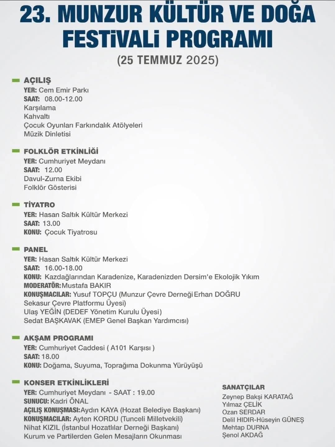 Dersim’de her yıl büyük bir coşku ve kararlılıkla düzenlenen Munzur Kültür ve Doğa Festivali bu yıl 23. kez kapılarını açıyor. “Dersim Yaşamdır! Doğama, İrademe, İnancıma, Dilime Dokunma!” şiarıyla düzenlenen festival, 25 Temmuz 2025 Cuma günü başta Hozat ilçesi olmak üzere birçok noktada eşzamanlı etkinliklerle kutlanacak.