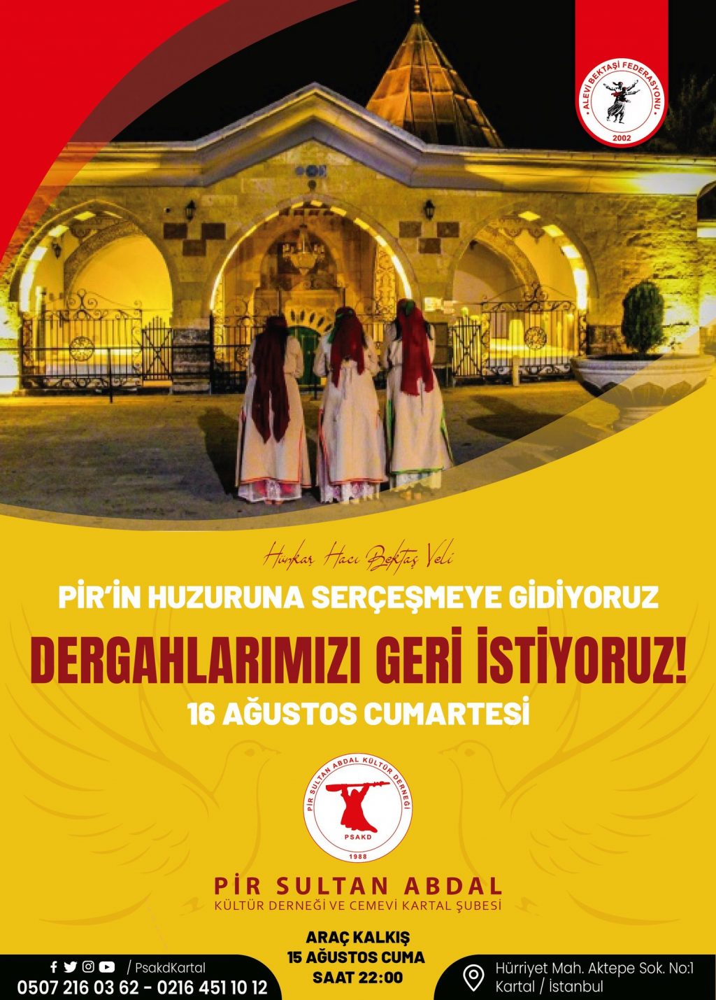 ⌈Haber merkezi⌉ Pir Sultan Abdal Kültür Derneği ve Cemevi Kartal Şubesi, 16 Ağustos Cumartesi günü Hacı Bektaş Veli Dergâhı’na yönelik kitlesel bir yürüyüş gerçekleştirecek. “Pir’in Huzuruna Serçeşmeye Gidiyoruz, Dergâhlarımızı Geri İstiyoruz!” şiarıyla düzenlenecek buluşmada Aleviler, asırlardır kendilerine ait olan inanç merkezlerine sahip çıkacaklarını bir kez daha ilan edecek.