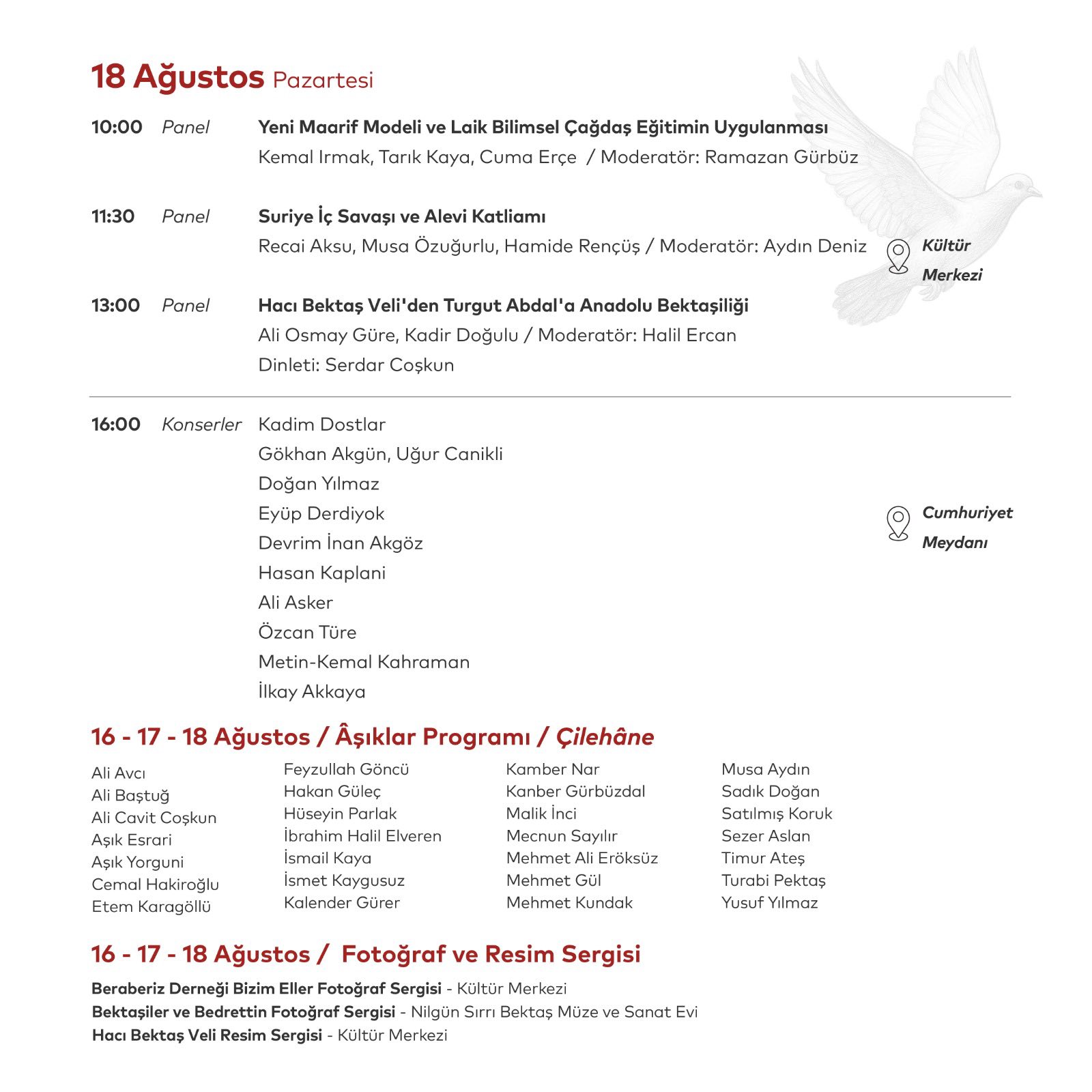 ’da “Yeni Maarif Modeli ve Laik Bilimsel Eğitim” paneliyle başlayacak. 11.30’da “Suriye İç Savaşı ve Alevi Katliamı”, 13.00’te ise “Hacı Bektaş Veli’den Turgut Abdal’a Anadolu Bektaşiliği” başlıklı paneller düzenlenecek.