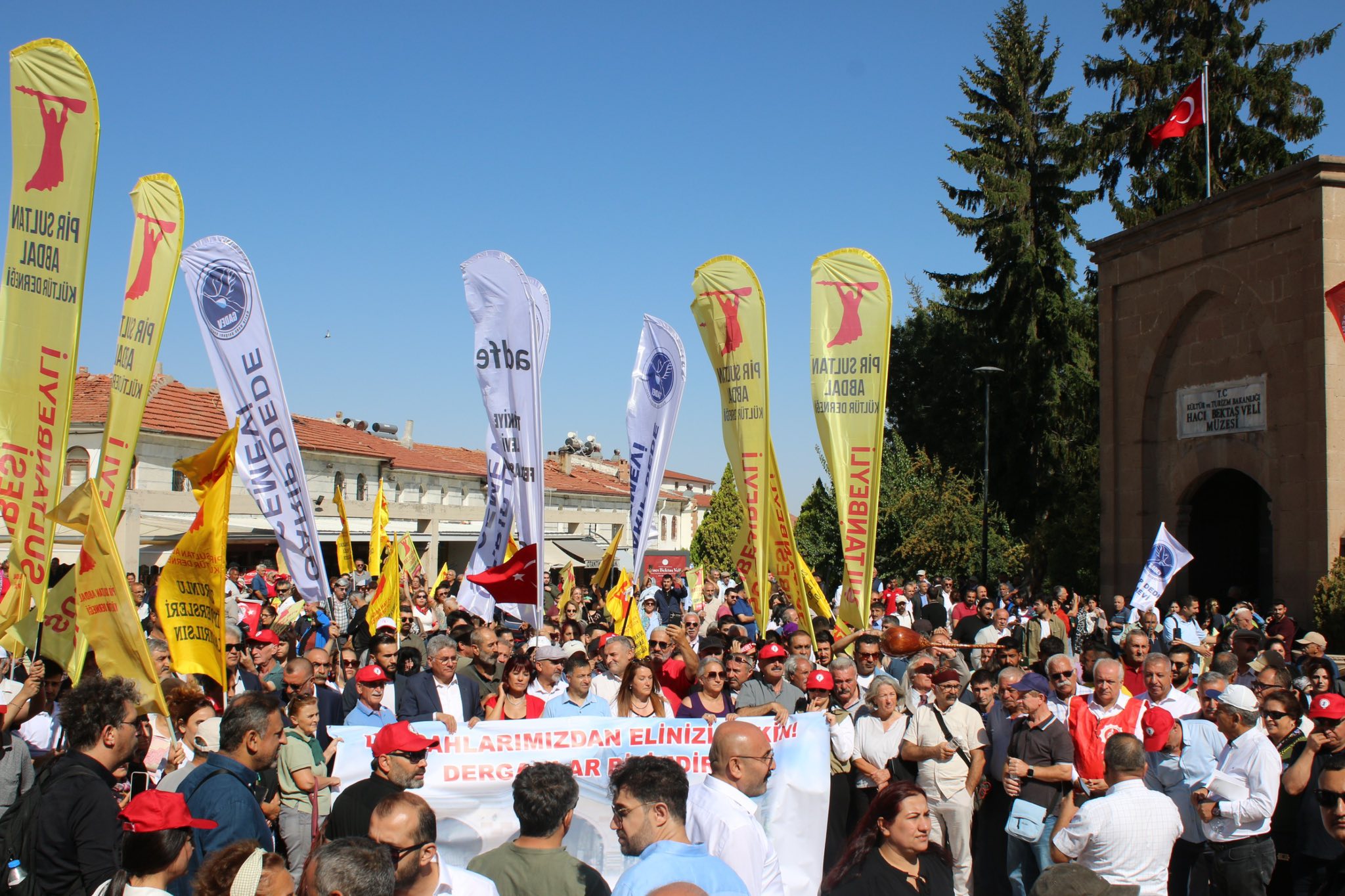⌈Haber Merkezi⌉ Avrupa Alevi Birlikleri Konfederasyonu (AABK) Eşit Başkanı Hüseyin Mat, Hacı Bektaş Veli Anma ve Kültür Sanat Etkinlikleri kapsamında dergâhın önünde yapılan mitingte konuştu. Mat, devlet eliyle kurdurulan Alevi Bektaşi Kültürü ve Cemevi Başkanlığı’nı sert sözlerle eleştirdi ve Hacı Bektaş Veli Dergâhı’nın Alevilere iadesi için hukuki sürecin başlatıldığını duyurdu.