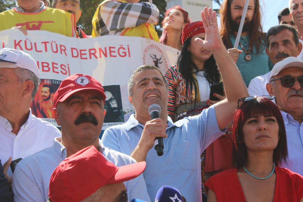 “Erdoğan’ın yeni atamış olduğu Alevi Bektaşi Kültür ve Cemevi Başkanı demiş ki: ‘Halk gelecek yıl 16 Ağustos’ta biz burada etkinlik yapacağız, Alevi kurumları ya bize dahil olurlar ya da silinirler.’ Gelecek yıl 16 Ağustos’ta yine burada olacağız, sıkıysa buyursun gelsinler. Burayı boş bilmesinler. Gelecek yıl 16 Ağustos’ta yine buradayız.”