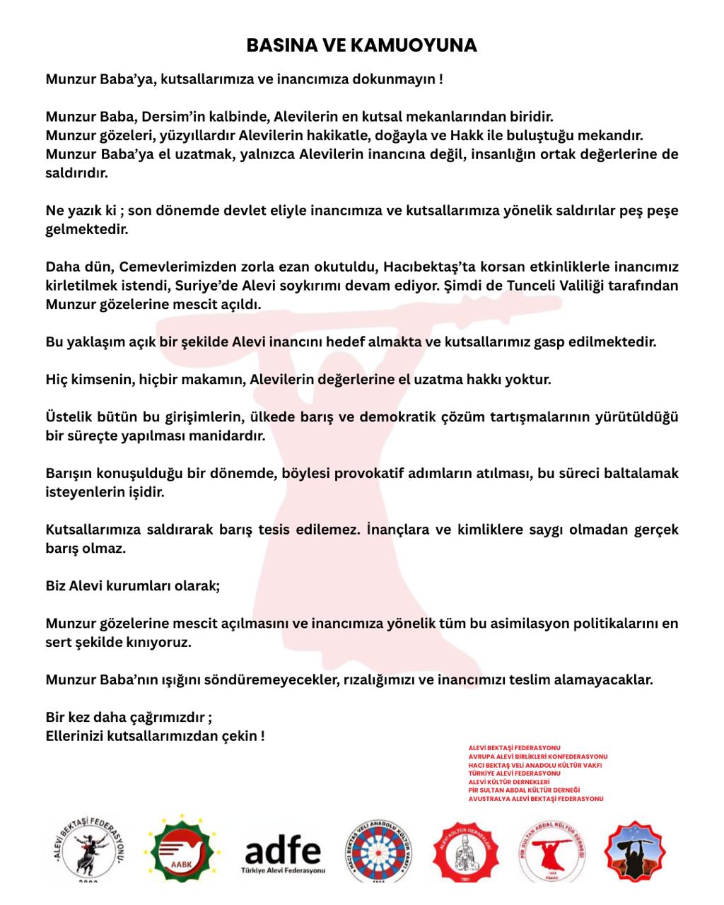 ⌈Sevde Ergin – AHA⌉ Alevi Bektaşi Federasyonu, Avrupa Alevi Birlikleri Konfederasyonu, Hacı Bektaş Veli Anadolu Kültür Vakfı, Türkiye Alevi Federasyonu, Alevi Kültür Dernekleri, Pir Sultan Abdal Kültür Derneği ve Avustralya Alevi Bektaşi Federasyonu yaptıkları ortak açıklamada, Dersim’in kalbinde yer alan Munzur Baba ve Düzgün Baba ziyaretlerinin Aleviler açısından kutsallığını vurguladı. Bu alanların yüzyıllardır Alevilerin inançlarını yaşattıkları, toplumsal hafızalarını korudukları ve doğayla bütünleştikleri mekânlar olduğuna dikkat çekildi.