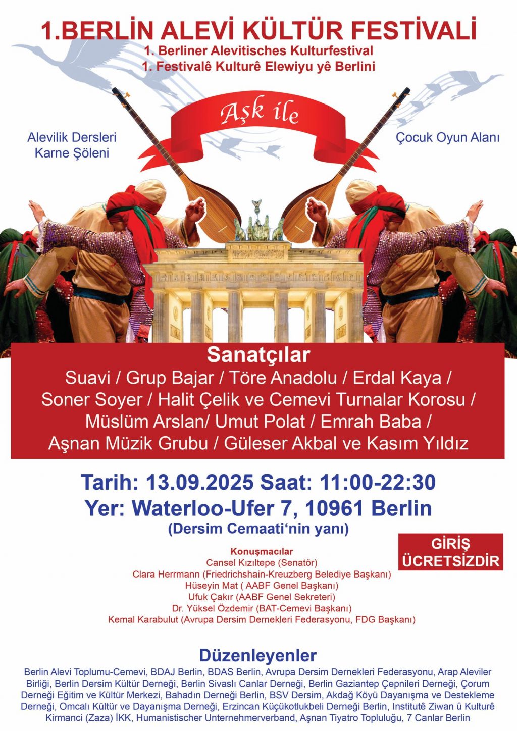 ⌈AHA – Berlin⌉ Berlin Alevi Toplum-Cemevi, Avrupa Dersim Dernekleri Federasyonu, Arap Aleviler Birliği ve çok sayıda Alevi köy ve yöre derneği tarafından düzenlenen 1. Berlin Alevi Kültür Festivali, 13 Eylül 2025 tarihinde Almanya’nın başkenti Berlin’de gerçekleştirilecek. Festival, Alevi kültürünün, inancının ve sanatının bir araya geleceği büyük bir buluşma olacak.