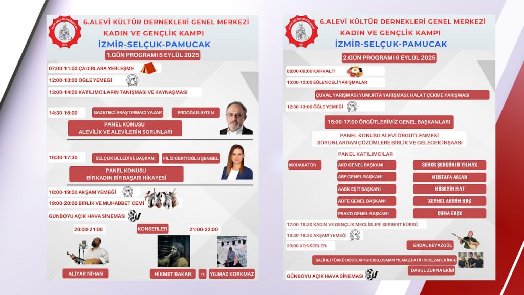 ⌈Haber Merkezi⌉ Alevi Kültür Dernekleri Genel Merkezi, 5-6-7 Eylül 2025 tarihlerinde İzmir Selçuk Pamucak Kamp Alanı’nda 6. Kadın ve Gençlik Kampı düzenliyor. Üç gün sürecek kamp, paneller, atölyeler, konserler ve açık hava etkinlikleriyle dolu bir program sunacak.