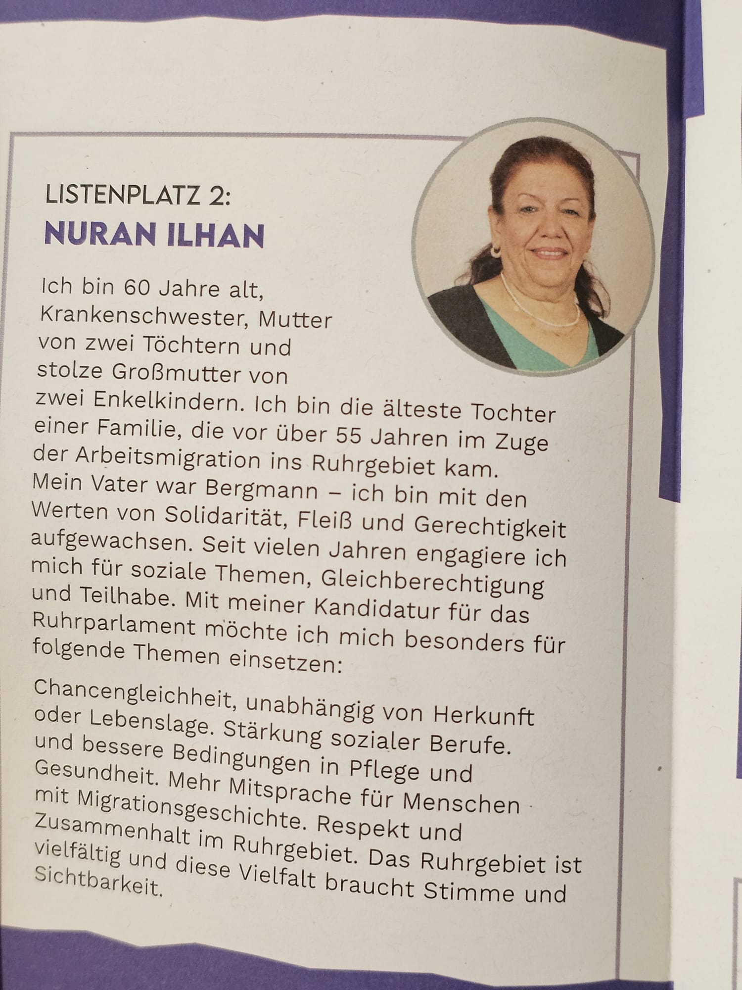 ⌈Haber Merkezi⌉ 14 Eylül 2025’te Almanya’nın Kuzey Ren-Vestfalya (NRW) eyaletinde yapılacak Ruhr Parlamentosu (Regionalverband Ruhr) seçimleri öncesi, uzun yıllardır sosyal alanlarda aktif olan Nuran Ilhan adaylığını kamuoyuna duyurdu.