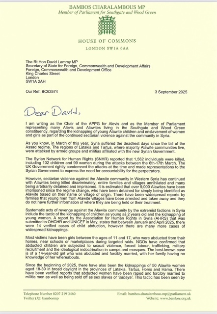 İngiltere Parlamentosu Alevi Sekretaryası (APPG) Başkanı ve İşçi Partisi Milletvekili Bambos Charalambous, Suriye’deki Alevi topluluklarına yönelik soykırım ve saldırılar hakkında Birleşik Krallık Dışişleri Bakanı David Lammy’ye bir mektup gönderdi.