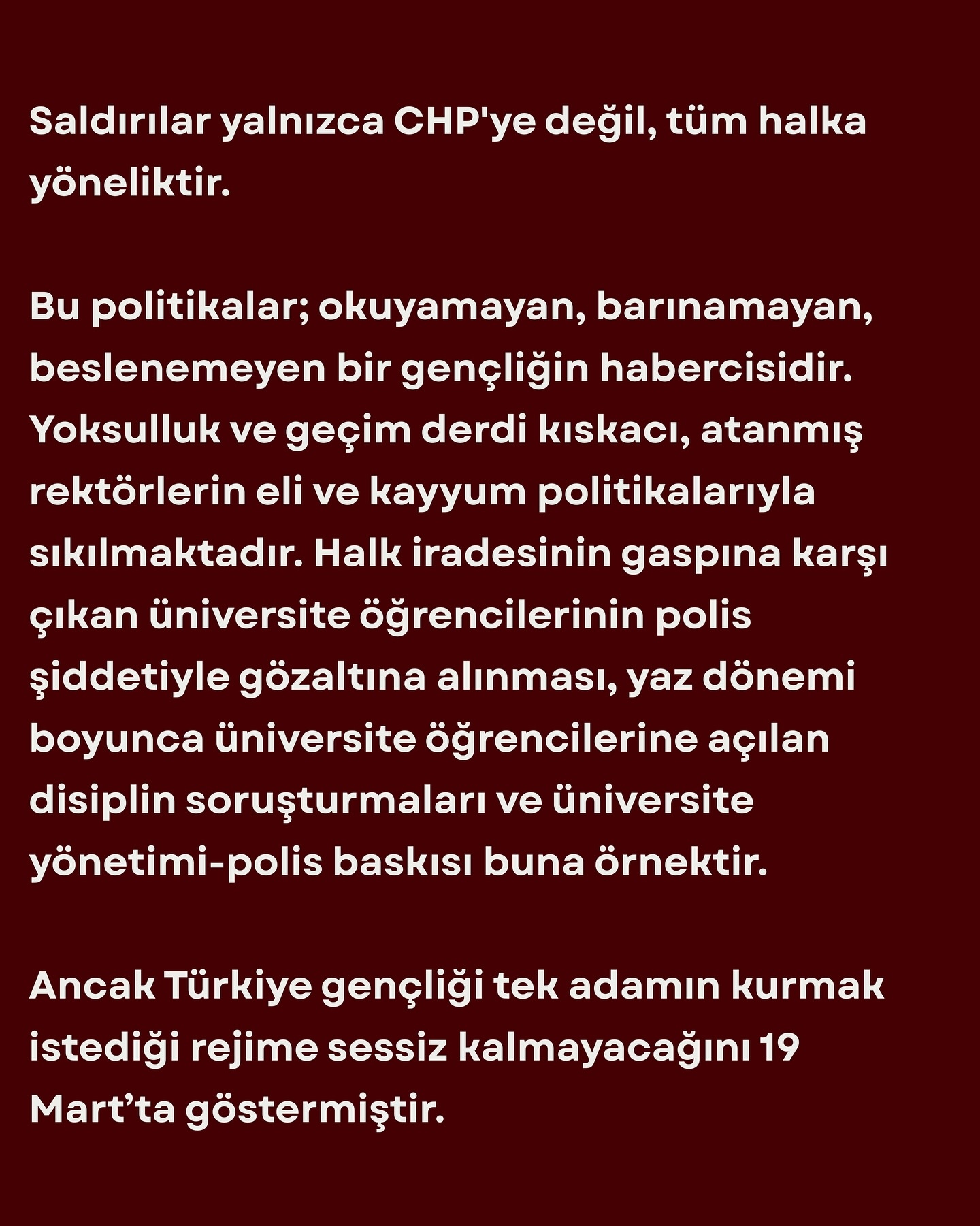 Emek Gençliği, söz konusu uygulamaların yalnızca CHP’ye değil, tüm halka yönelik olduğunu belirterek, barınamayan, beslenemeyen ve eğitim hakkından mahrum bırakılan gençliğin giderek daha fazla baskı altına alındığını ifade etti. Üniversitelerde kayyum politikaları, polis şiddetiyle gözaltılar, disiplin soruşturmaları ve yönetim-polis baskısının bu tabloyu tamamladığına dikkat çekildi.