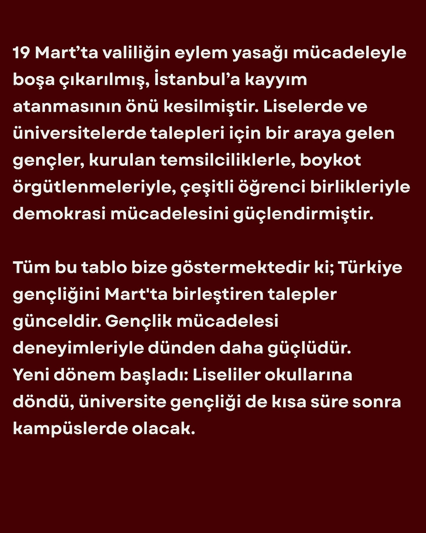 Açıklamada, Türkiye gençliğinin tek adam rejimine karşı sessiz kalmadığına vurgu yapılarak, 19 Mart’ta gerçekleşen kitlesel eylemler hatırlatıldı. Valiliğin eylem yasağının mücadeleyle boşa çıkarıldığı, İstanbul’a kayyum atanmasının önünün kesildiği, liselerde ve üniversitelerde öğrencilerin temsilcilikler ve boykot örgütlenmeleriyle demokrasi mücadelesini güçlendirdiği kaydedildi.