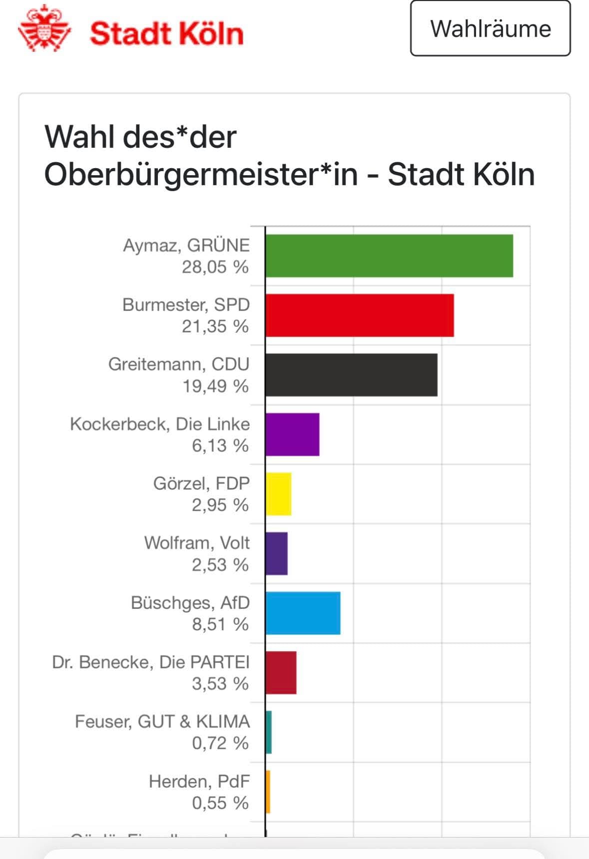 Köln Büyükşehir Belediye Başkanlığı için oyların yaklaşık yüzde 90’ı sayıldı. İlk sonuçlara göre Yeşiller’in adayı Berivan Aymaz yüzde 27,6 oy oranıyla önde görünüyor. SPD’nin adayı Torsten Burmester yüzde 21,6 ile ikinci sırada, CDU’nun adayı Markus Greitemann ise yüzde 19,2 ile üçüncü sırada yer alıyor. Sonuçların bu şekilde kesinleşmesi halinde 28 Eylül’de yapılacak ikinci tur seçimlerde Aymaz ile Burmester yarışacak.