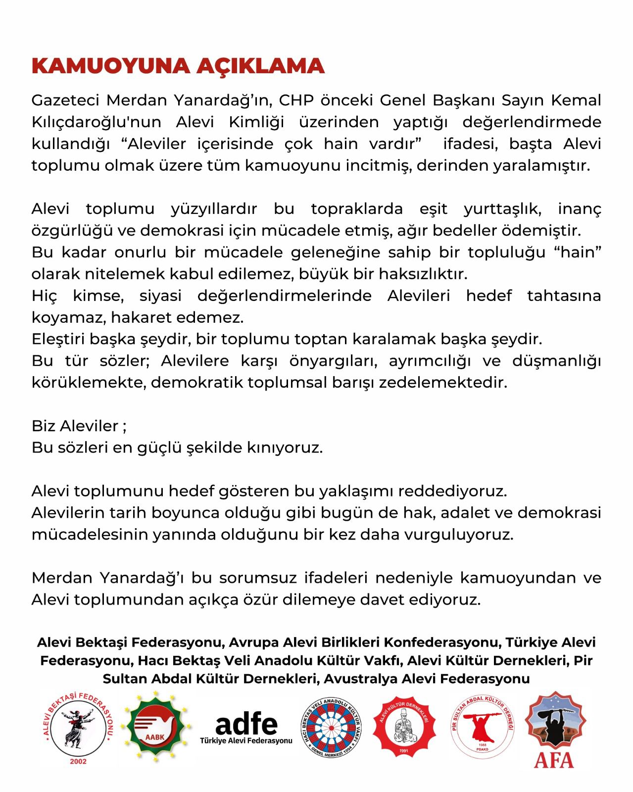 “Gazeteci Merdan Yanardağ’ın, CHP önceki Genel Başkanı Sayın Kemal Kılıçdaroğlu’nun Alevi Kimligi üzerinden yaptığı değerlendirmede kullandığı ‘Aleviler içerisinde çok hain vardır’ ifadesi, başta Alevi toplumu olmak üzere tüm kamuoyunu incitmiş, derinden yaralamıştır.