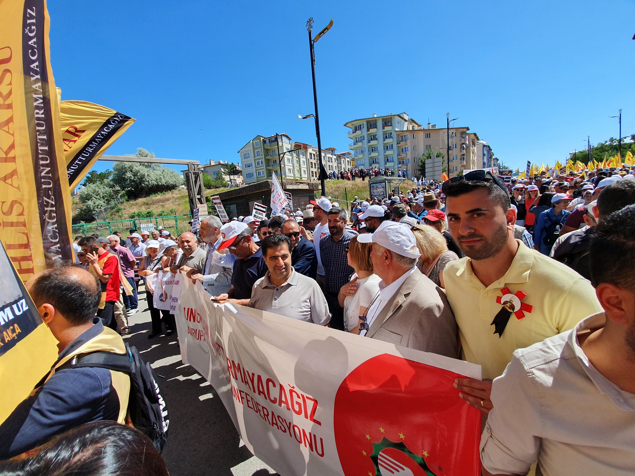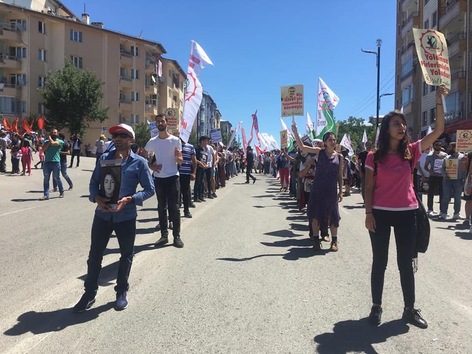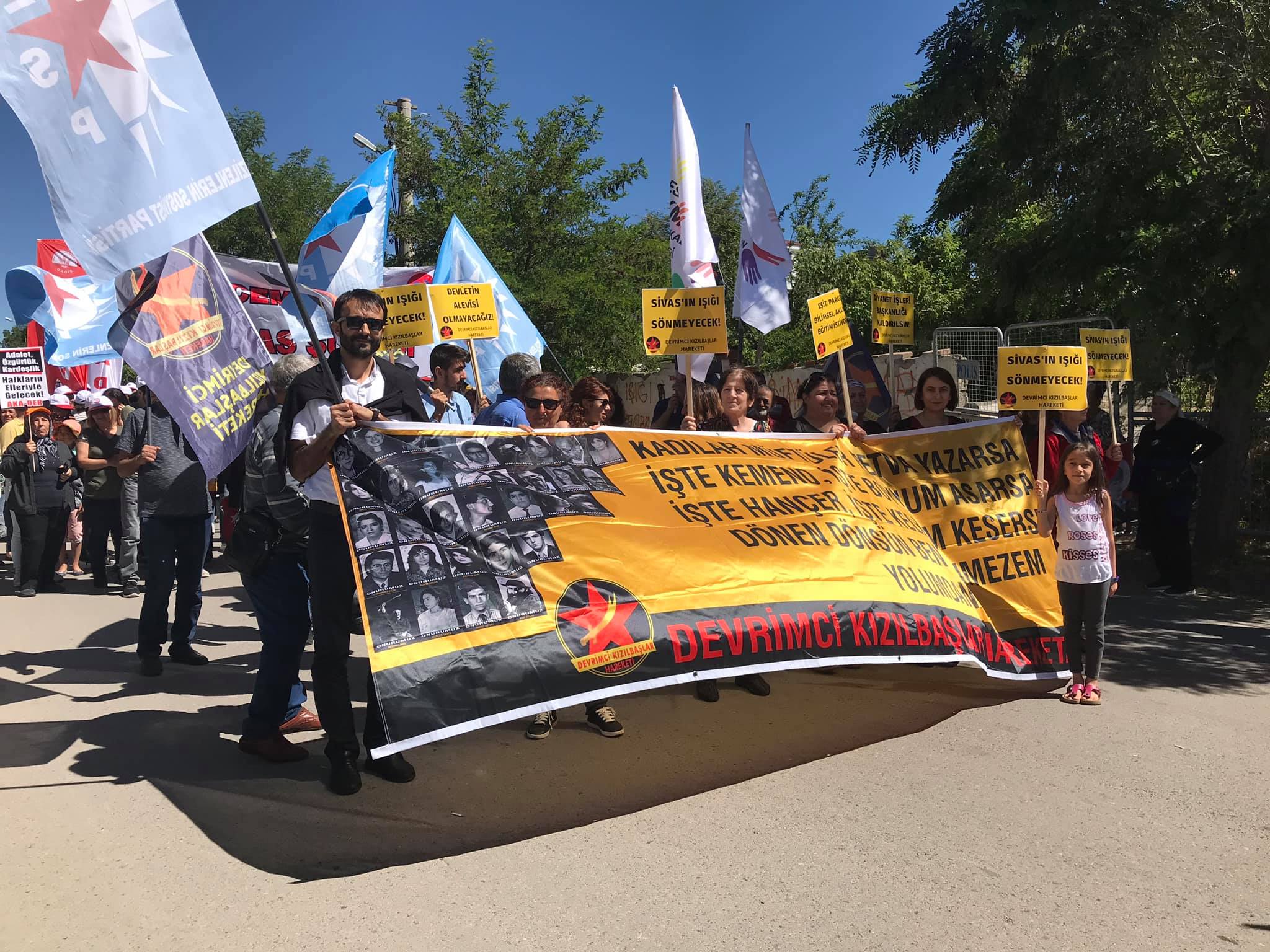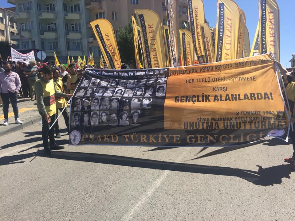 Yaşamını yitirenlerin fotoğrafların taşındığı yürüyüşte yine Hasret Gültekin’in bağlamasını temsilen bağlamalar taşındı. Yürüyüş boyunca “Sivas’ı unutmadık”, “Faşizme karşı omuz omuza”, “Pir sultanlar ölmez direniş büyüyor”, “Sivas’ın hesabı sorulacak ‘’, Aleviyiz, Haklıyız, Kazanacağız! ‘’, ‘’Devletin Alevisi olmayacağız!’’, ‘’ Maraş, Dersim, Sivas, Koçgiri Unutlmaz Hiçbiri’’ sloganlar atıldı.