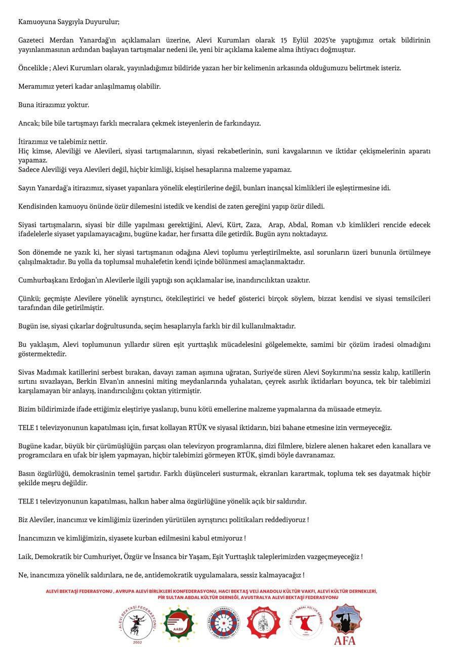 ”Gazeteci Merdan Yanardağ’ın açıklamaları üzerine, Alevi Kurumları olarak 15 Eylül 2025’te yaptığımız ortak bildirinin yayınlanmasının ardından başlayan tartışmalar nedeni ile, yeni bir açıklama kaleme alma ihtiyacı doğmuştur.