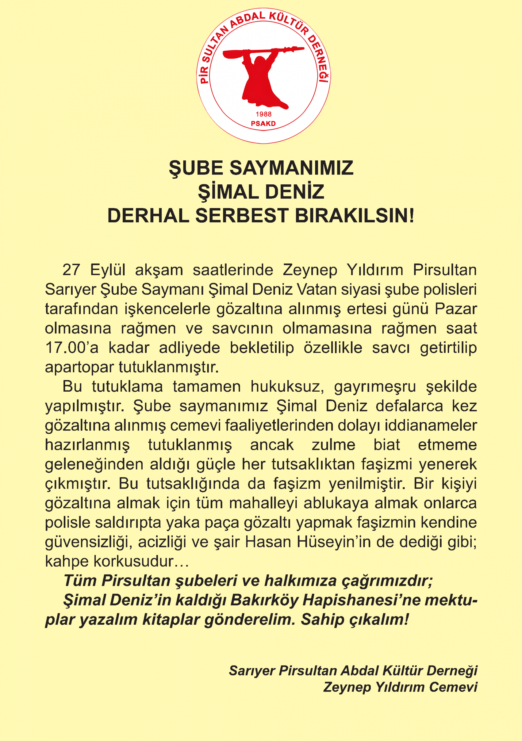 Pir Sultan Abdal Kültür Derneği Sarıyer Şubesi/ Zeynep Yıldırım Cemevi:Şimal Deniz Derhal Serbest Bırakılsın