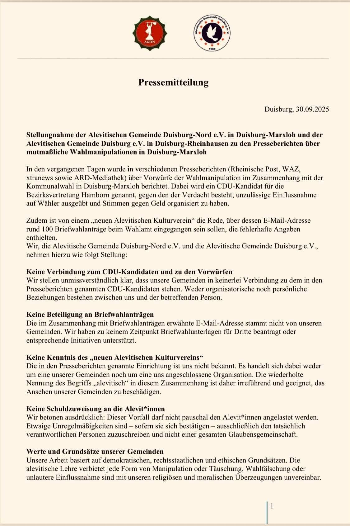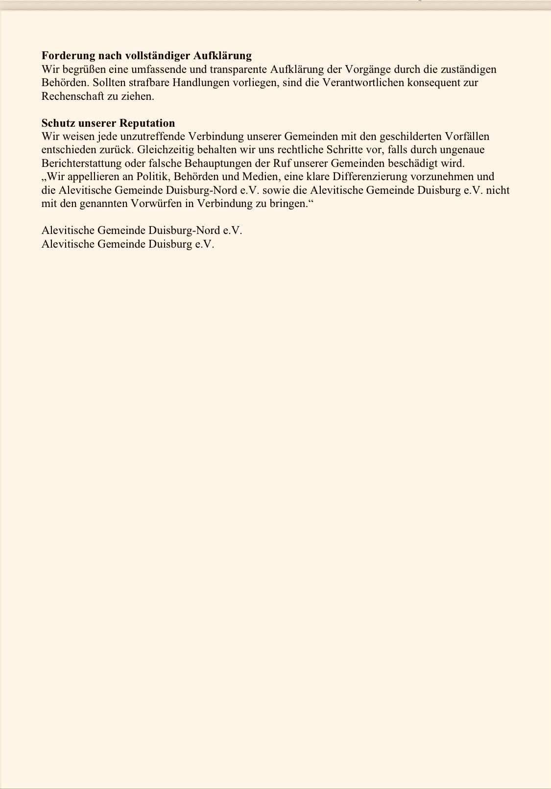 “Lütfen açık bir ayrım yapın ve Duisburg-Nord Alevi Toplumu (Alevitische Gemeinde Duisburg-Nord e.V.) ile Duisburg-Rheinhausen Alevi Toplumu (Alevitische Gemeinde Duisburg e.V.)’ni söz konusu iddialarla ilişkilendirmeyin.”