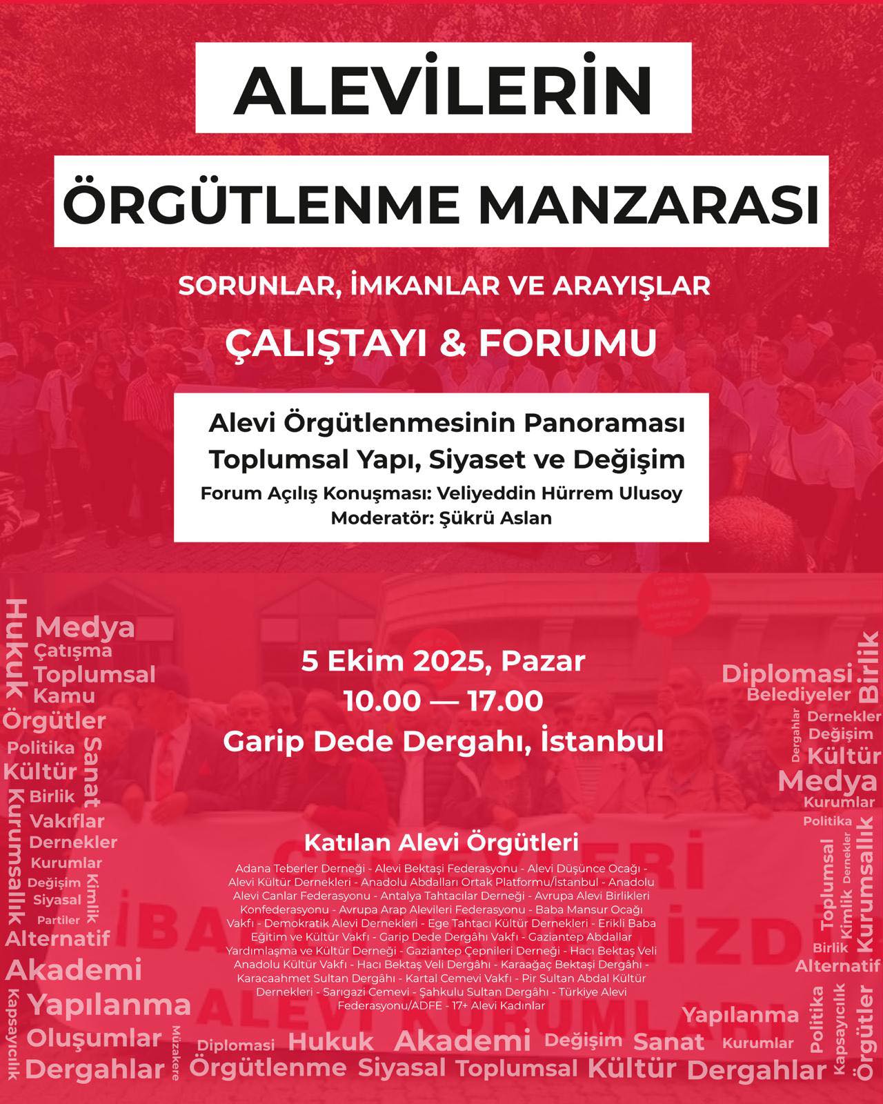 “Alevilerin Örgütlenme ” Sorunlar, İmkânlar ve Arayışlar” başlıklı çalıştay ve forum, 5 Ekim 2025 Pazar günü İstanbul Garip Dede Dergahı’nda gerçekleştirilecek. Sabah 10.00’da başlıyacak etkinlik, akşam 17.00’ye kadar sürecek.