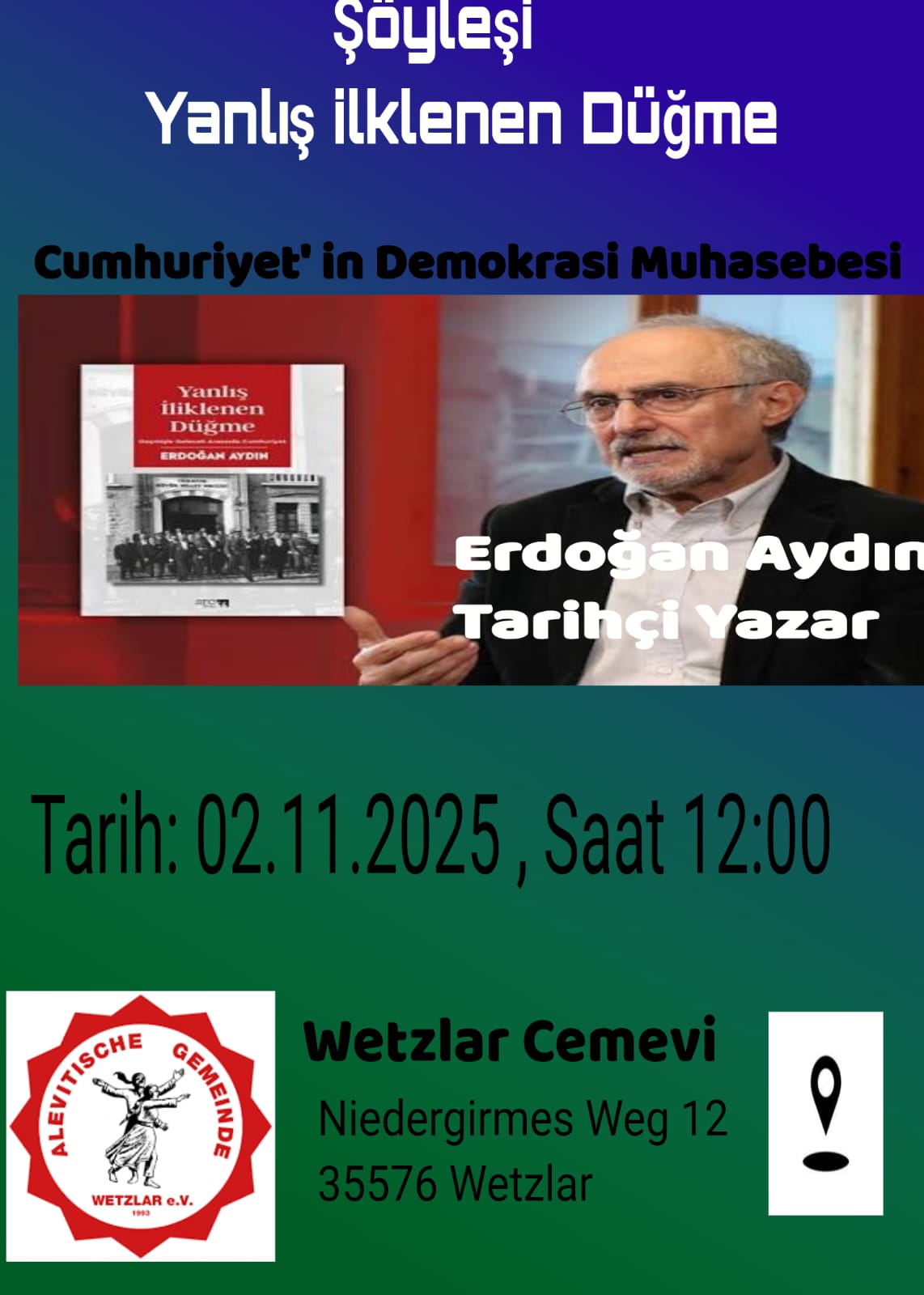 ⌈Haber Merkezi⌉  Tarihçi-yazar Erdoğan Aydın, Ekim ayı sonunda Almanya’nın farklı kentlerinde Alevi kurumlarının ev sahipliğinde düzenlenecek bir dizi panel ve söyleşiyle okurlarıyla buluşacak. Söyleşi dizisi kapsamında Aydın, hem “Yanlış İliklenen Düğme – Geçmişle Gelecek Arasında Cumhuriyet” kitabını tartışmaya açacak hem de Alevi kurumlarının çağrısıyla düzenlenen “Barış ve Demokrasi Mücadelesinde Aleviler” başlıklı panele katılacak.