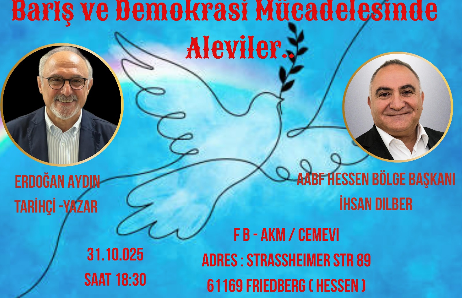 Panel, AABF Hessen Bölge Başkanı İhsan Dilber ve Erdoğan Aydın’ın katılımıyla Friedberg AKM / Cemevinde gerçekleştirilecek. Etkinlikte Alevi toplumunun barış, demokrasi ve eşit yurttaşlık mücadelesi tarihsel ve güncel yönleriyle ele alınacak.