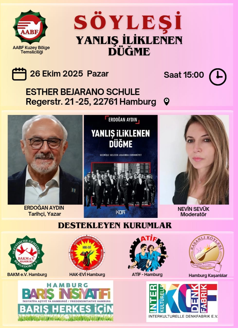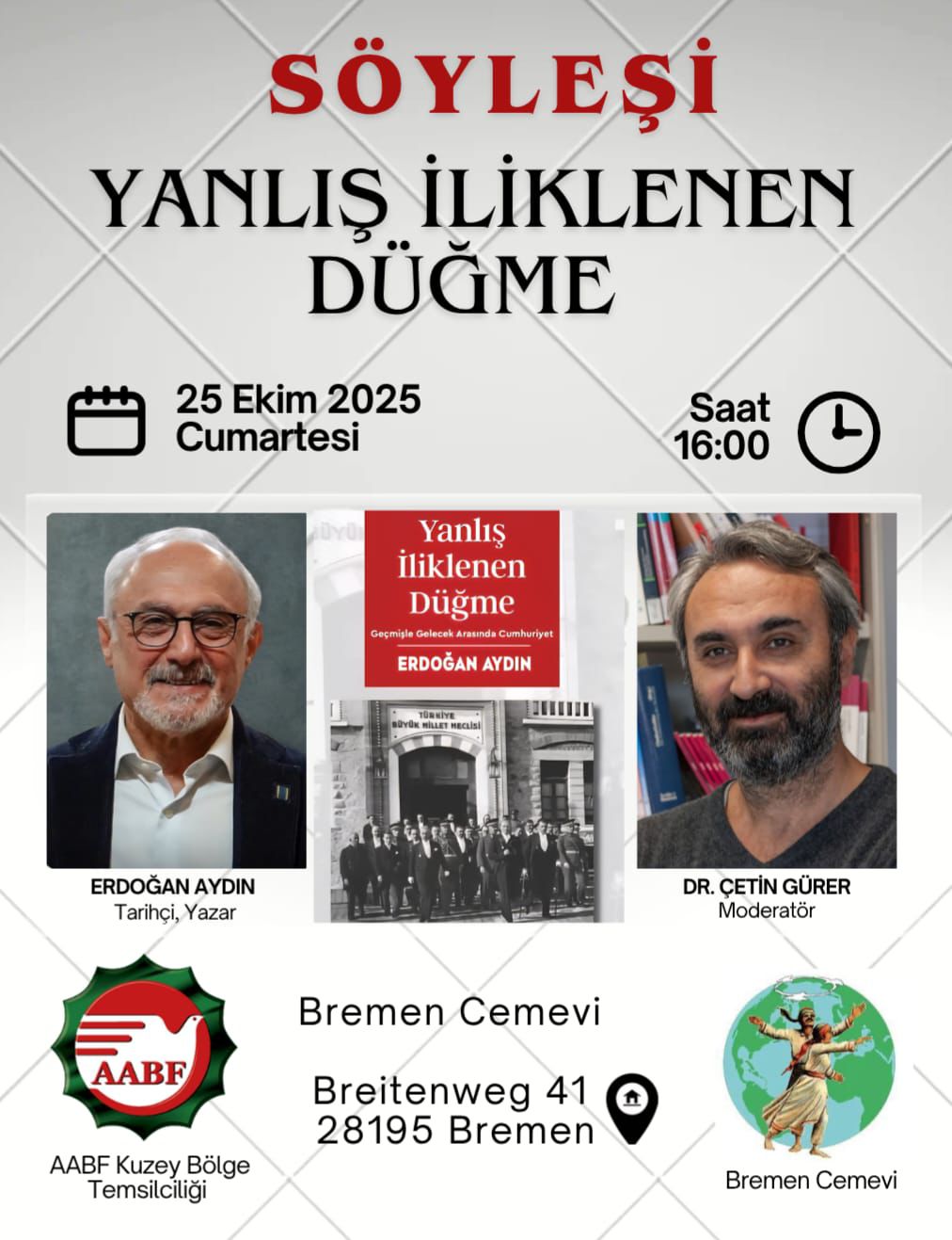 İkinci durak, 25 Ekim Cumartesi günü Bremen Cemevi olacak; söyleşi Dr. Çetin Gürer moderatörlüğünde gerçekleştirilecek.