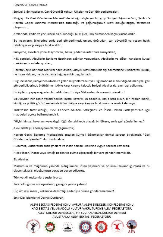 ⌈Haber Merkezi⌉ Alevi Bektaşi Federasyonu (ABF), Avrupa Alevi Birlikleri Konfederasyonu (AABK), Hacı Bektaş Veli Anadolu Kültür Vakfı Federasyonu, Alevi Kültür Dernekleri, Pir Sultan Abdal Kültür Derneği ve Avustralya Alevi Bektaşi Federasyonu, Muğla/Ula Geri Gönderme Merkezi’nde tutulduğu belirtilen Suriyeli Alevi sığınmacıların sınır dışı edilme ihtimaline ilişkin ortak bir açıklama yayımladı. Kurumlar, “Hiç kimse inancı, kimliği veya politik görüşü nedeniyle ölüme gönderilemez. Sınır dışı işlemleri derhal durdurulmalıdır” çağrısında bulundu.