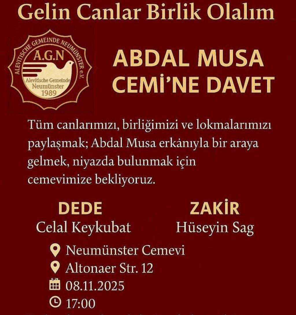 Neumünster Alevi Kültür Merkezi, Abdal Musa’nın yol ışığında bir araya gelmek için tüm canlara çağrıda bulundu. 8 Kasım 2025 akşamı düzenlenecek cemde gönüllerin birleneceği, lokmaların rızayla paylaşılacağı belirtildi. Cemi yürütecek Dede Celal Keykubat ile Zakir Hüseyin Sağ’ın hizmetleriyle erkânın yol üzere sürdürüleceği ifade edildi.