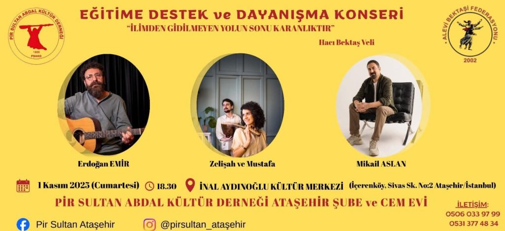 ⌈Haber Merkezi⌉ Pir Sultan Abdal Kültür Derneği ve Cemevi Ataşehir Şubesi, 1 Kasım 2025 Cumartesi günü “Eğitime Destek ve Dayanışma Konseri” düzenliyor. “İlimden gidilmeyen yolun sonu karanlıktır” diyen Hacı Bektaş Veli’nin sözleriyle anlam kazanan etkinlik, gençlerin eğitimine katkı sunmayı amaçlıyor.