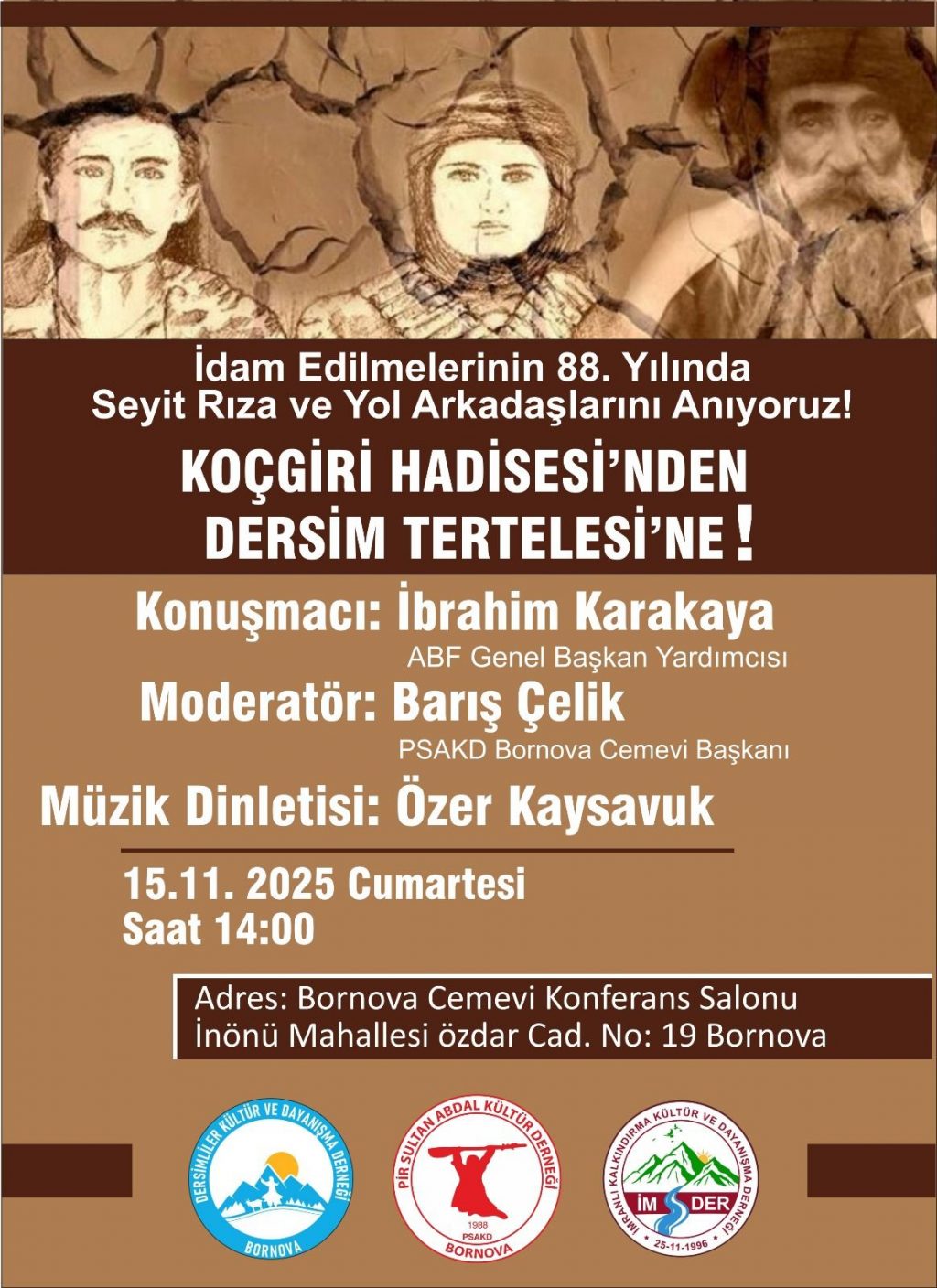 ⌈Haber Merkezi⌉ Pir Sultan Abdal Kültür Derneği (PSAKD) Bornova Şubesi, Dersimliler Kültür ve Dayanışma Derneği ile İMDER’in ortak organizasyonuyla Seyit Rıza ve yol arkadaşlarının idam edilişinin 88. yılında “Koçgiri Hadisesi’nden Dersim Tertelesi’ne” başlıklı anma ve panel düzenlenecek.