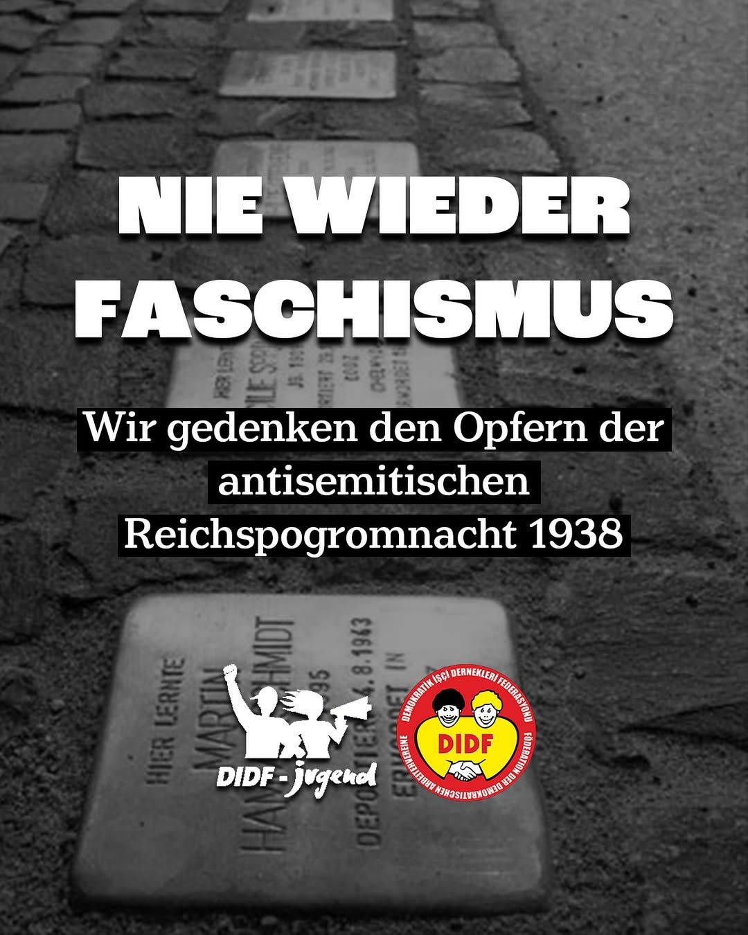 ⌈Haber Merkezi⌉ Demokratik İşçi Dernekleri Federasyonu (DIDF) ve DIDF-Gençlik, 9 Kasım 1938’de Almanya genelinde Yahudi halkına yönelik gerçekleştirilen faşist saldırıların yıldönümünde yayımladıkları açıklamada, “Bir daha asla” sözünü kararlılıkla hatırlatarak, savaş, ayrımcılık ve nefret politikalarına karşı barış çağrısında bulundu.