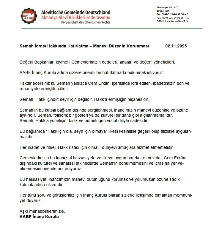 AABF İnanç Kurulu’nun bu açıklaması, son dönemlerde Avrupa’daki kimi etkinliklerde Semah’ın ibadet bağlamı dışında sahnelenmesine karşı Alevi yol erkânının özünü koruma yönünde yapılan güçlü bir kurumsal uyarı olarak değerlendiriliyor.