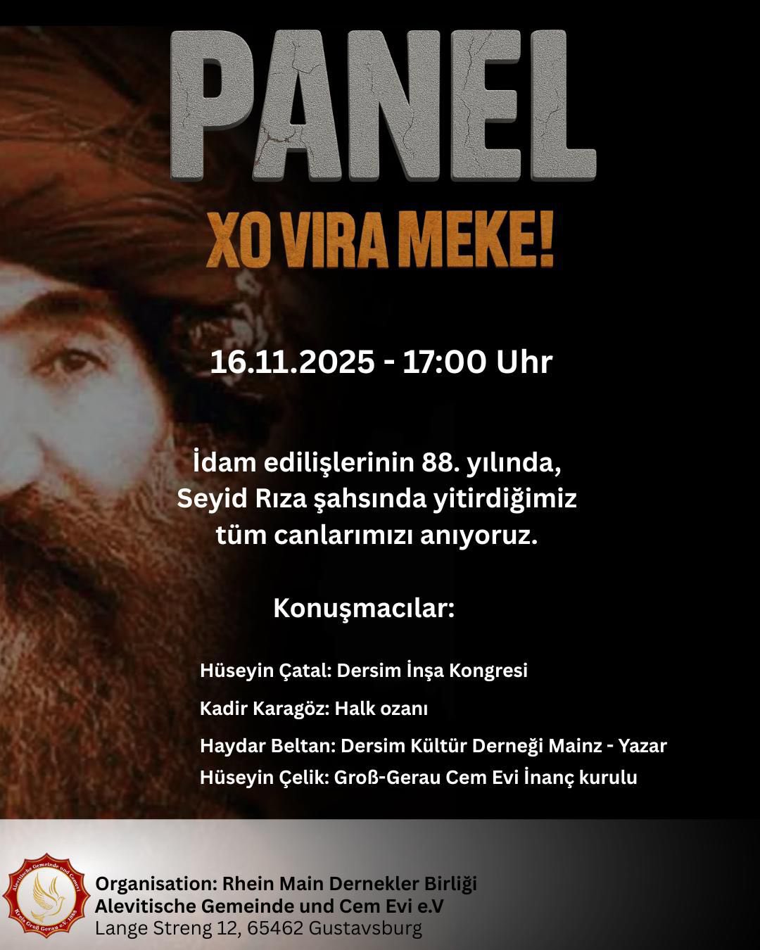 “15 Kasım 1937 Kara Gün” başlığıyla yapılacak panelde konuşmacılar arasında Hüseyin Çatal (Dersim İnşa Kongresi), Kadir Karagöz (Halk ozanı), Haydar Beltan (Dersim Kültür Derneği Mainz – Yazar) ve Hüseyin Çelik (Groß-Gerau Cemevi İnanç Kurulu) yer alıyor.