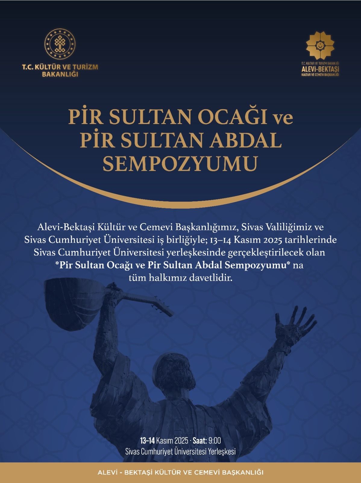 ⌈Haber Merkezi⌉ Alevi-Bektaşi Kültür ve Cemevi Başkanlığı, Sivas Valiliği ve Sivas Cumhuriyet Üniversitesi iş birliğiyle 13–14 Kasım 2025 tarihlerinde “Pir Sultan Ocağı ve Pir Sultan Abdal Sempozyumu” düzenleniyor. Etkinliğin tanıtım afişinde üç kurumun logosu yer alırken, sempozyumun Sivas Cumhuriyet Üniversitesi yerleşkesinde yapılacağı bildirildi.
