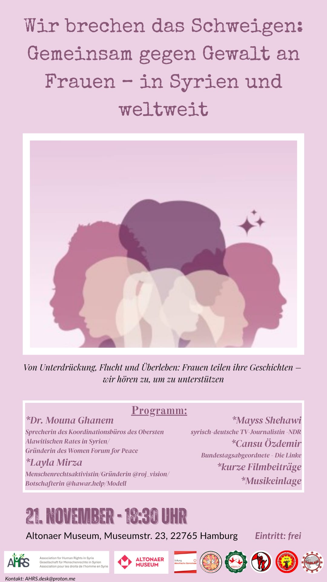 Hamburg – Suriye’de savaş, baskı ve sürgün koşulları altında yaşam mücadelesi veren kadınların sesi Hamburg’da duyuruluyor. 21 Kasım 2025’te Altonaer Museum’da yapılacak panelde, kadınların tanıklıkları, yaşadıkları şiddet biçimleri ve dayanışma yolları ele alınacak. Etkinlik “Wir brechen das Schweigen: Gemeinsam gegen Gewalt an Frauen – in Syrien und weltweit” başlığı altında düzenleniyor.