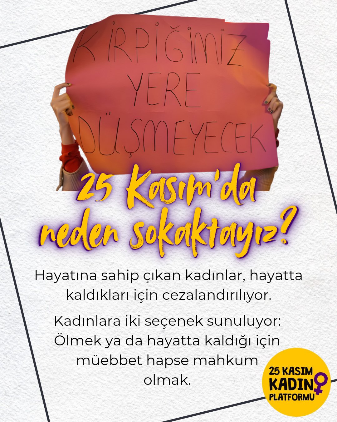 Platform, Türkiye’de hayatına sahip çıkan kadınların hayatta kaldıkları için cezalandırıldığını belirterek kadınlara sunulan iki seçenek olduğuna dikkat çekti: “Ölmek ya da hayatta kaldığı için müebbet hapse mahkûm olmak.”