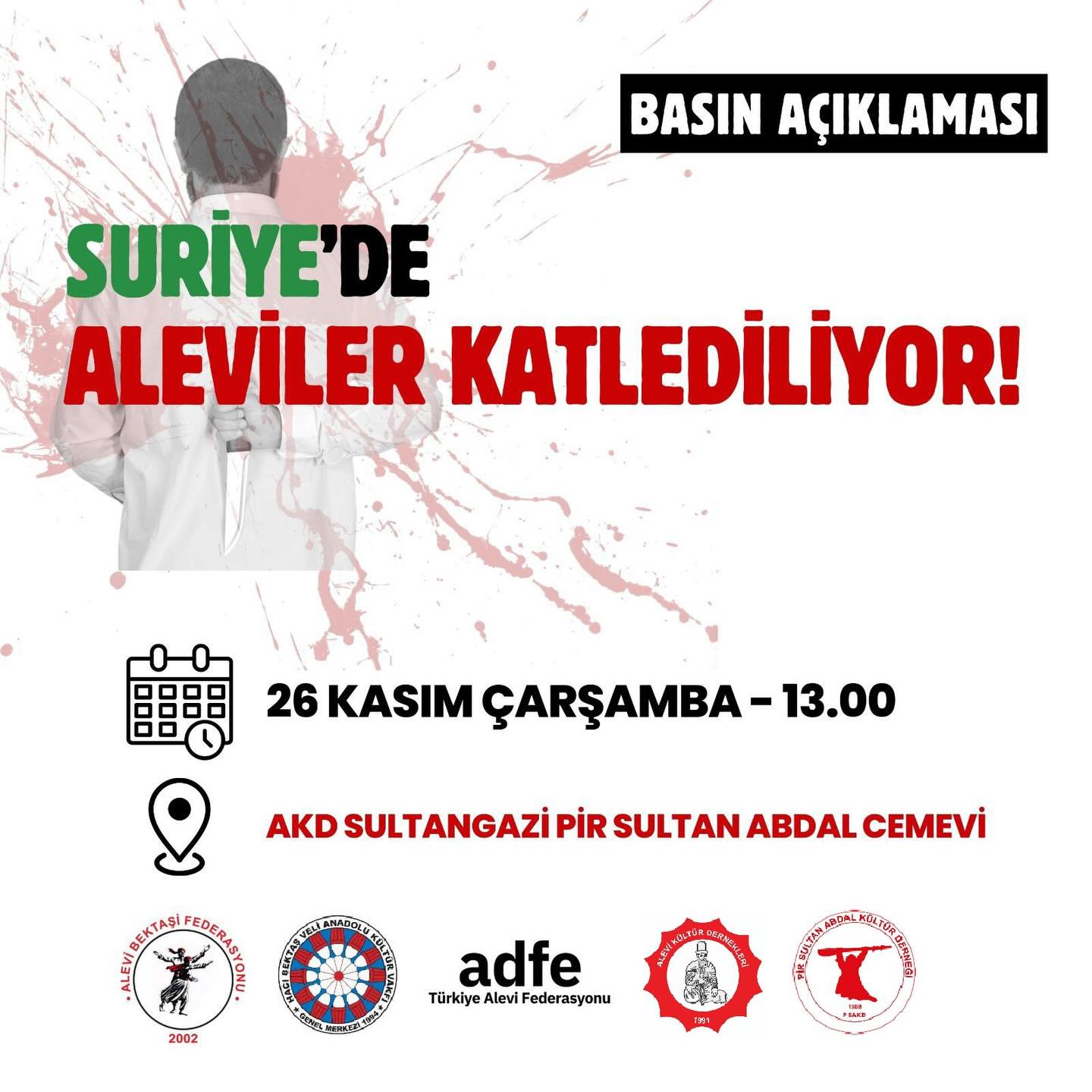 ⌈Haber Merkezi⌉ Alevi Bektaşi Federasyonu (ABF), Hacı Bektaş Veli Anadolu Kültür Vakfı (HBVAKV), Türkiye Alevi Federasyonu (ADFE), Pir Sultan Abdal Kültür Derneği (PSAKD) ve Alevi Kültür Dernekleri (AKD), Suriye’de Alevilere yönelik artan saldırılara karşı 26 Kasım Çarşamba günü İstanbul’da ortak bir basın açıklaması yapacaklarını duyurdu.