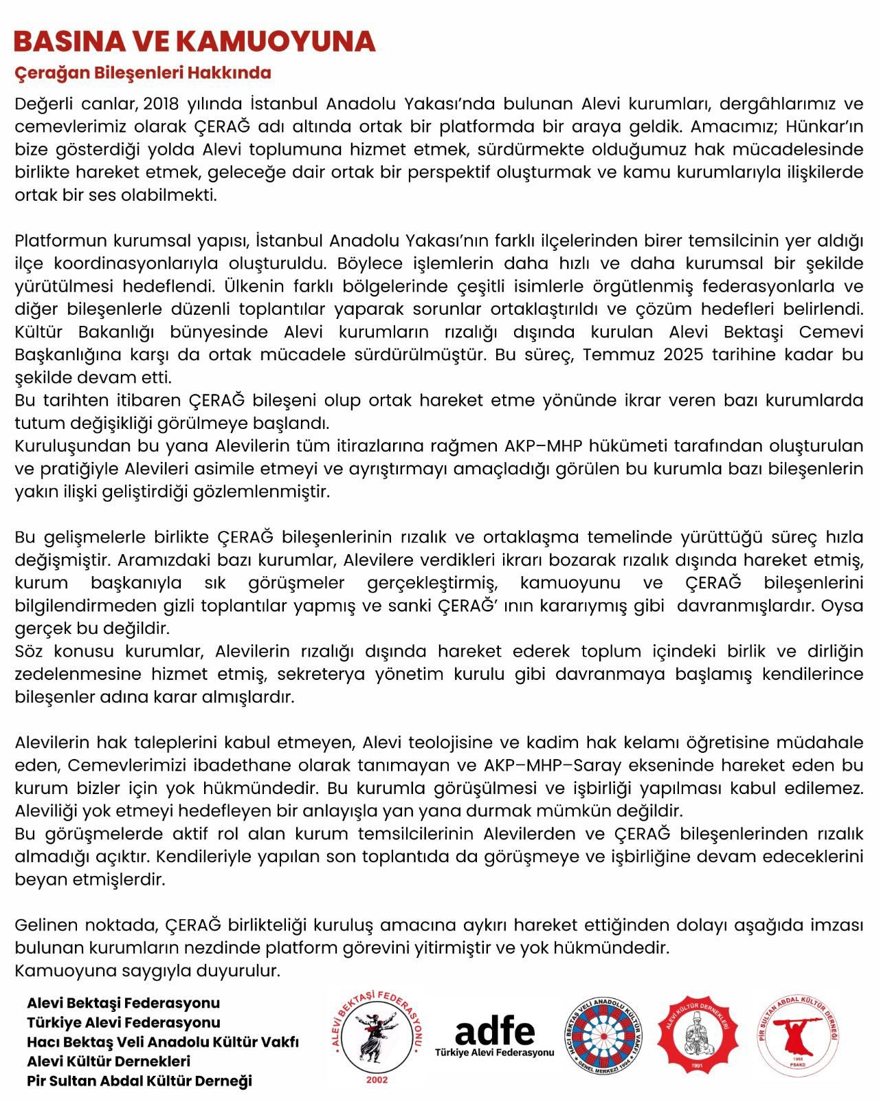 ⌈Haber Merkezi⌉ Alevi Bektaşi Federasyonu (ABF), Türkiye Alevi Federasyonu (ADFE), Hacı Bektaş Veli Anadolu Kültür Vakfı (HBVAKV), Alevi Kültür Dernekleri (AKD) ve Pir Sultan Abdal Kültür Derneği tarafından yapılan ortak açıklamada, İstanbul Anadolu Yakası’ndaki Alevi kurumlarının oluşturduğu ÇERAĞ platformunun kuruluş amacından saptığı ve gelinen noktada platformun imzacı kurumlar nezdinde yok hükmünde olduğu duyuruldu. Açıklamada, bazı bileşenlerin Alevi toplumunun rızalığı dışında hareket ettiği, devletin Alevilik alanına yönelik kurumsal müdahaleleriyle ilişki geliştirdiği ve bu durumun toplumsal birlik ve dirliği zedelediği vurgulandı.