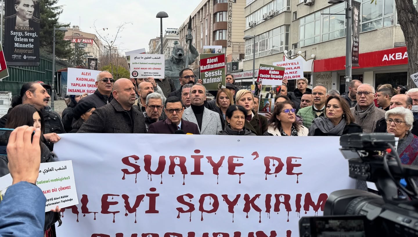 Suriye’de Alevi köylerine, mahallelerine ve inanç merkezlerine yönelik saldırılar sürerken Türkiye’nin birçok kentinde başlayan protestolar Ankara’ya da taşındı. Alevi kurumlarının Meclis Çankaya Kapısı önünde yapmak istediği dayanışma eylemi polis engeliyle karşılaşsa da açıklama yoğun katılımla gerçekleşti. Eylem boyunca “Suriye’de insanlık katlediliyor”, “Alevi halkı yalnız değildir” sloganları yükseldi.