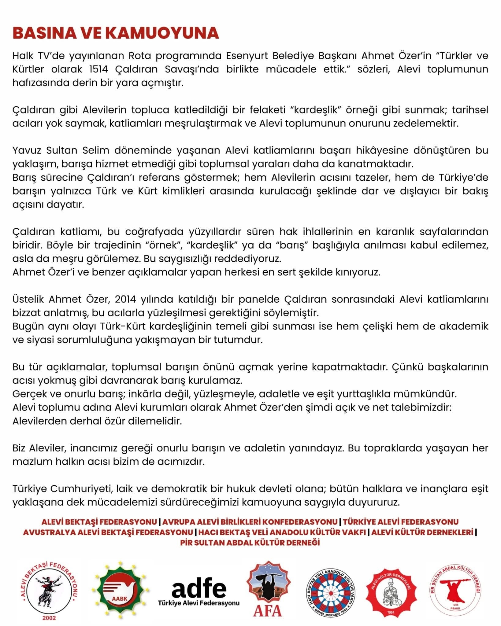 Alevi Bektaşi Federasyonu, Avrupa Alevi Birlikleri Konfederasyonu, Türkiye Alevi Federasyonu, Avustralya Alevi Bektaşi Federasyonu, Hacı Bektaş Veli Anadolu Kültür Vakfı, Alevi Kültür Dernekleri ve Pir Sultan Abdal Kültür Derneği, Halk TV’de yayınlanan Rota programında Esenyurt Belediye Başkanı Ahmet Özer’in Çaldıran Savaşı’na ilişkin sözlerine sert tepki gösterdi. Alevi kurumları ortak açıklamalarında, Çaldıran’ın “kardeşlik” örneği gibi sunulmasının Alevi toplumunun hafızasında derin bir yara açtığını vurguladı.