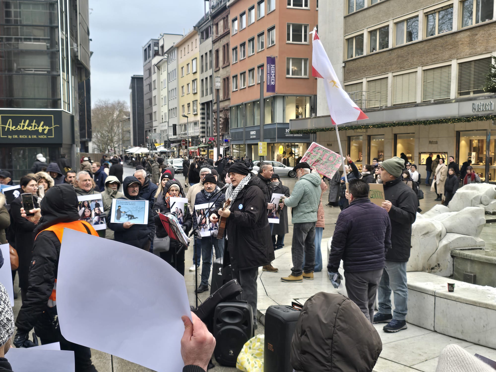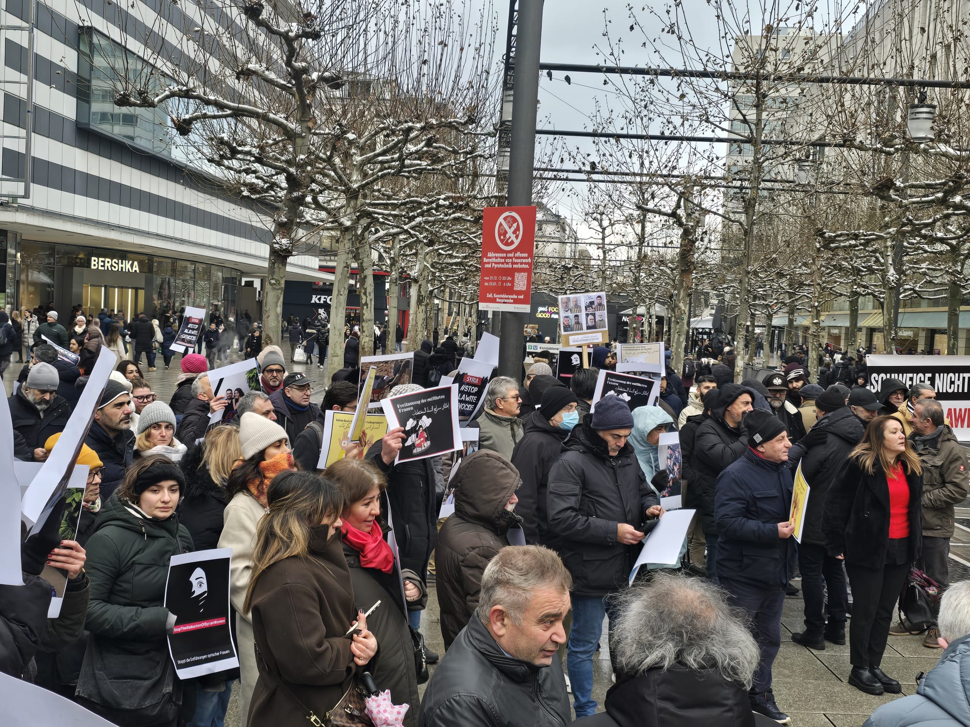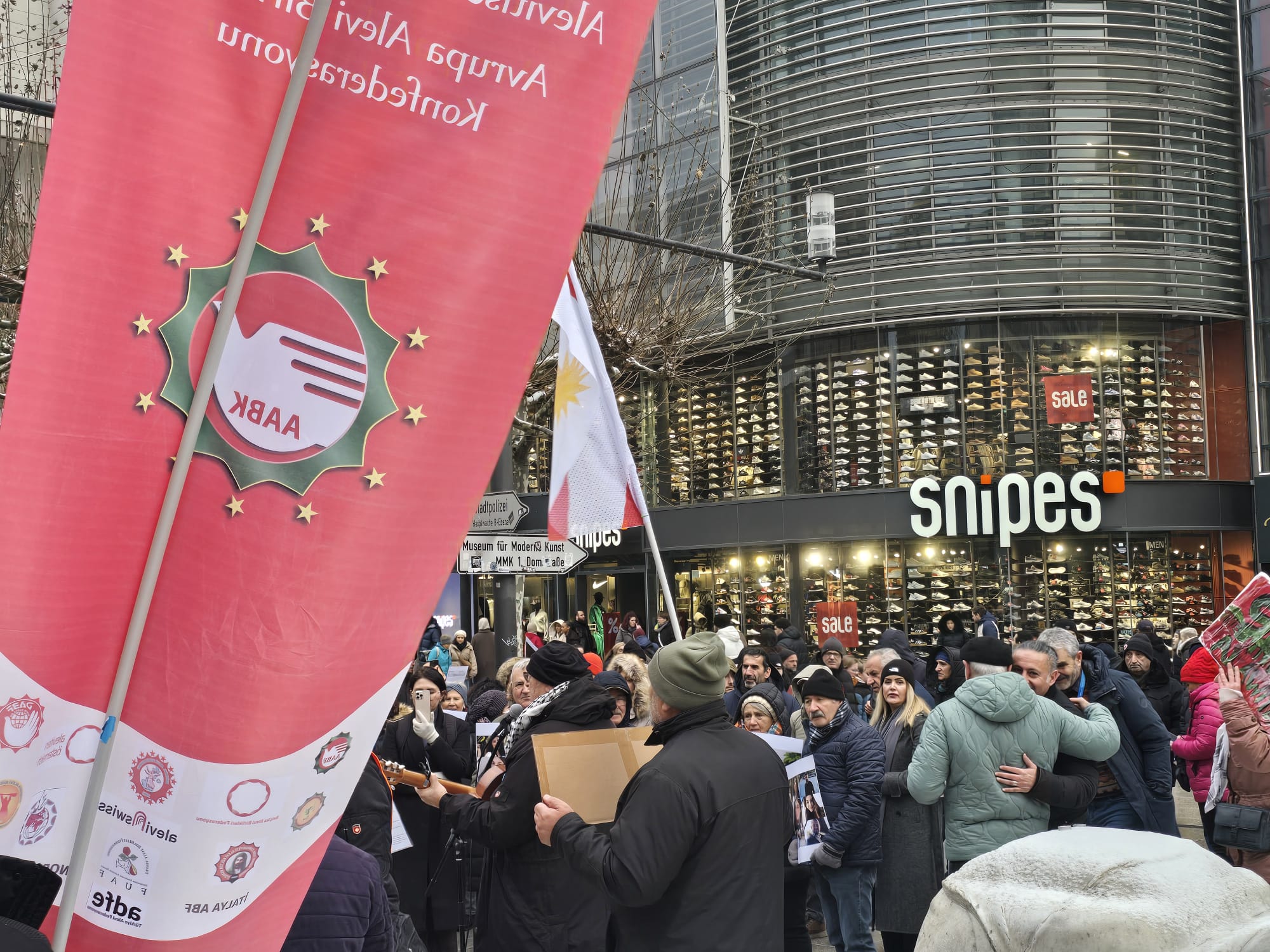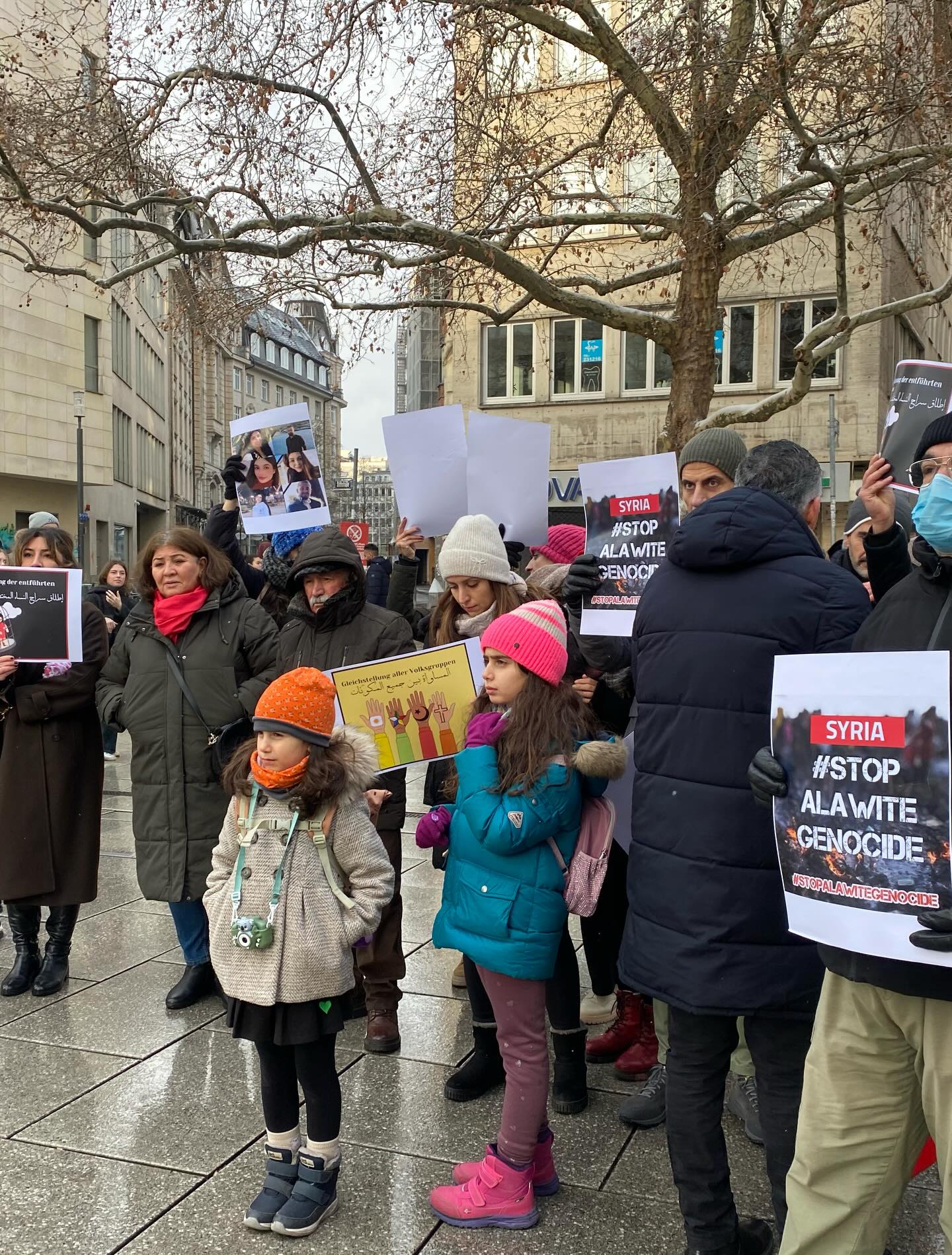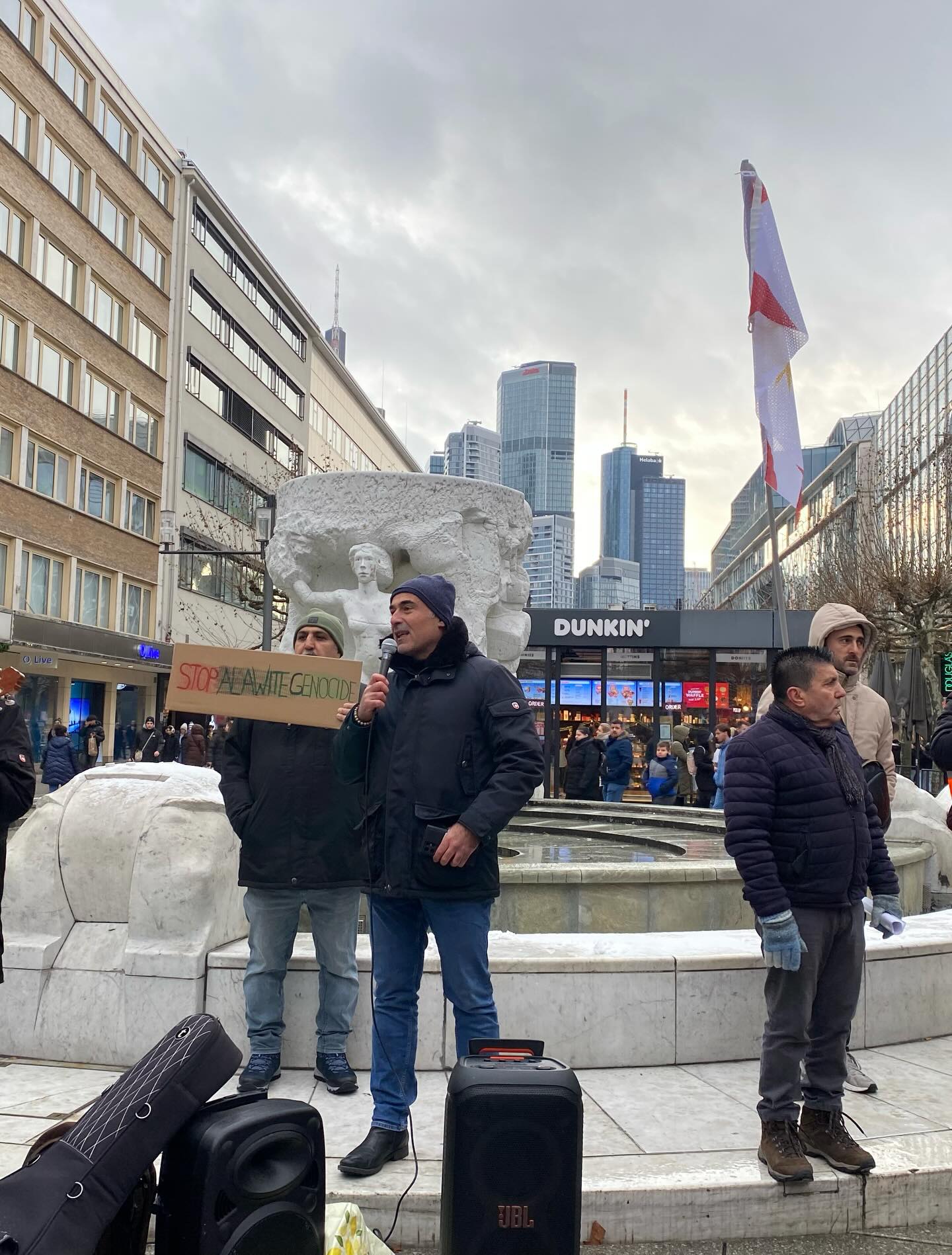 Frankfurt kent merkezinde, soğuk ve karlı havaya rağmen gerçekleştirilen mitinge yaklaşık 200 kişi katıldı. Katılımcılar, taşıdıkları pankartlar ve attıkları sloganlarla Suriye’de yaşanan insanlık suçlarının durdurulmasını, faillerin yargılanmasını ve Alevi halkının uluslararası koruma altına alınmasını talep etti.
