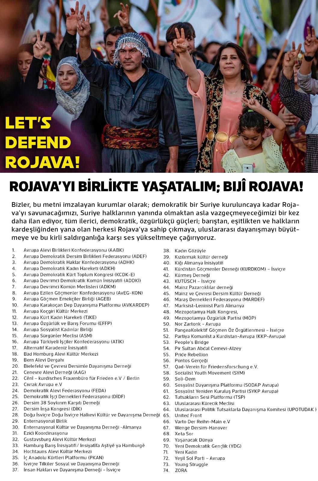 Avrupa Alevi Birlikleri Konfederasyonu (AABK) Avrupa Demokratik Dersim Birlikleri Federasyonu (ADDEF), Avrupa Demokratik Haklar Konfederasyonu (ADHK), Avrupa Demokratik Kadın Hareketi (ADKH), Avrupa Demokratik Kürt Toplum Kongresi (KCDK-E), Demokratik Alevi Federasyonu (FEDA) ve çok sayıda Alevi derneği, gençlik örgütü ve demokratik yapı” Rojava’yı Birlikte Yaşatalım; Bijî Rojava” başlıklı metni imzaladı
