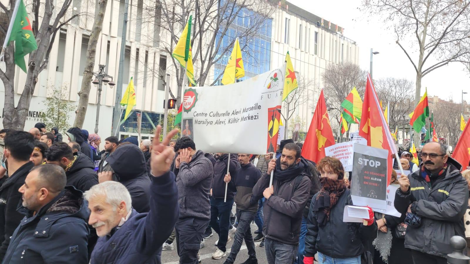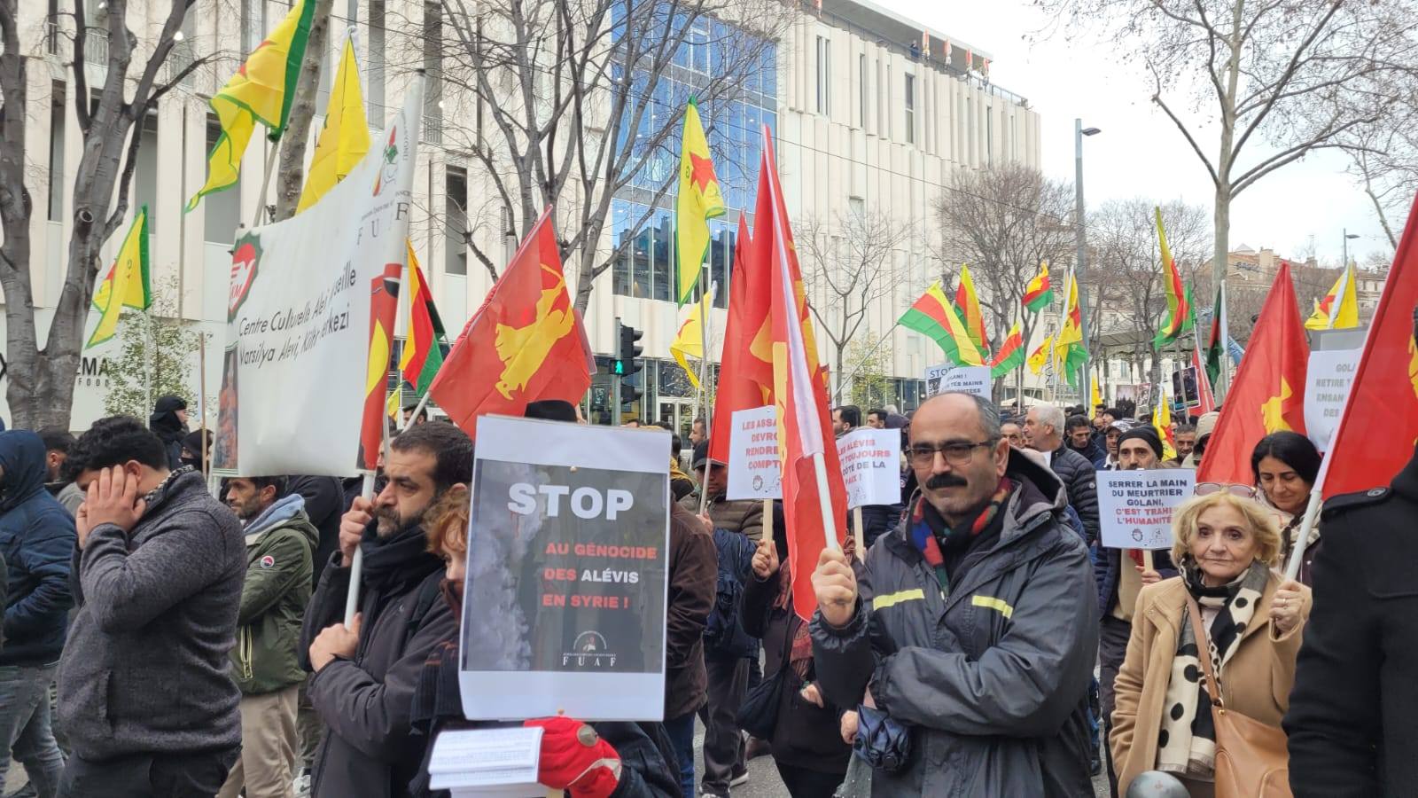 ⌈AHA⌉ Fransa Alevi Birlikleri Federasyonu, Suriye’de Alevilere, Dürzilere ve Hristiyanlara yönelik katliamlar ile Rojava’da Kürtlere karşı gerçekleştirilen saldırıları protesto etmek amacıyla Fransa’nın güneyindeki Marsilya kentinde basın açıklaması ve protesto eylemi düzenledi.