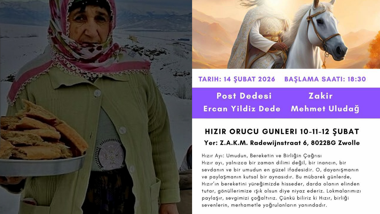 ⌈AHA⌉ Hollanda’nın Zwolle kentinde faaliyet yürüten Z.A.K.M. (Zwolle Alevi Kültür Merkezi), Hızır ayı vesilesiyle Hızır Cem’i düzenliyor. 14 Şubat 2026 Cumartesi günü gerçekleştirilecek cem erkânı, saat 18.30’da başlayacak.