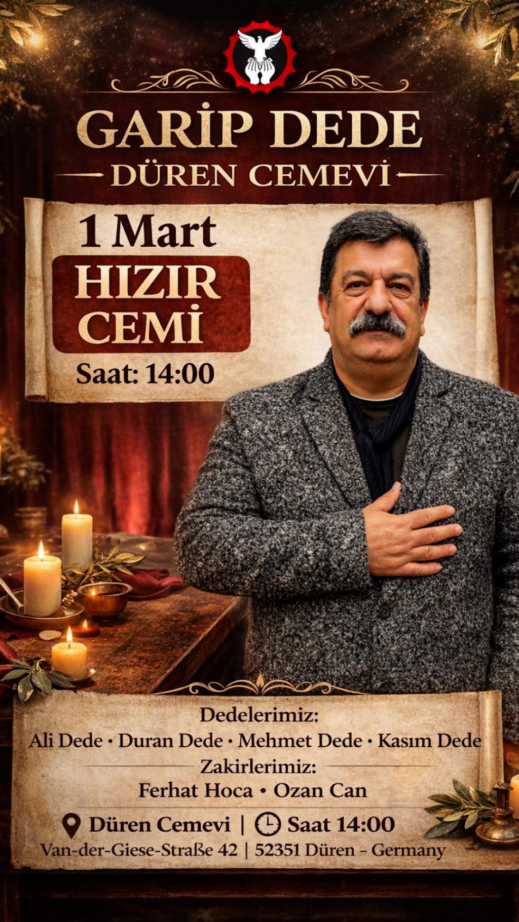 ⌈AHA⌉ Almanya’nın Düren kentinde faaliyet gösteren Düren Cemevi, 1 Mart Cumartesi günü Hızır Cemi düzenleyecek. Hızır ayı vesilesiyle gerçekleştirilecek cem erkânında Türkiye’den gelen Garip Dede de yol hizmeti yürütecek. Cem erkânına Düren ve çevresinde oturan canların yoğun katılım bekleniyor.
