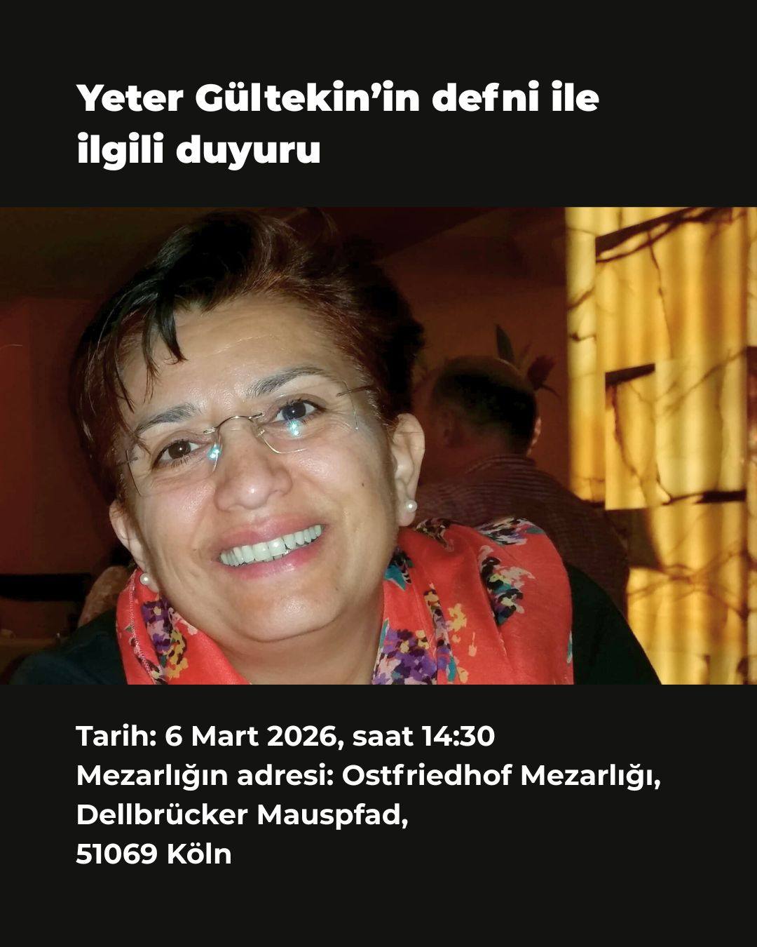 Yeter Gültekin, 6 Mart 2026 tarihinde saat 14.30’da Almanya’nın Köln kentinde bulunan Ostfriedhof Mezarlığı’nda (Dellbrücker Mauspfad, 51069 Köln) toprağa verilecektir.
