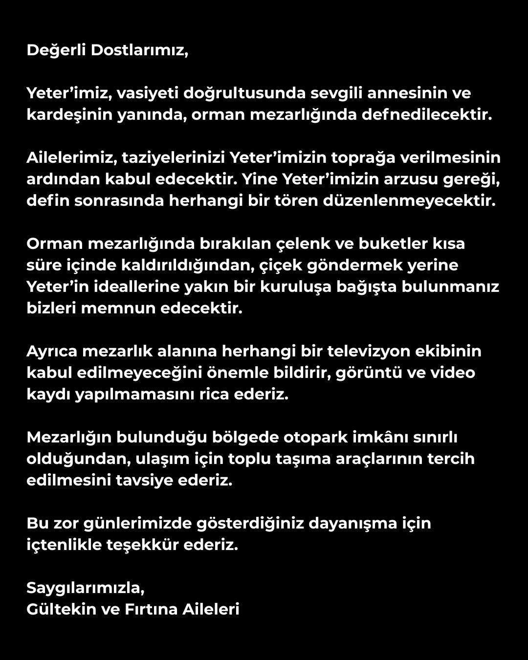 Ailelerimiz, taziyelerinizi Yeter’imizin toprağa verilmesinin ardından kabul edecektir. Yine Yeter’imizin arzusu gereği, defin sonrasında herhangi bir tören düzenlenmeyecektir.