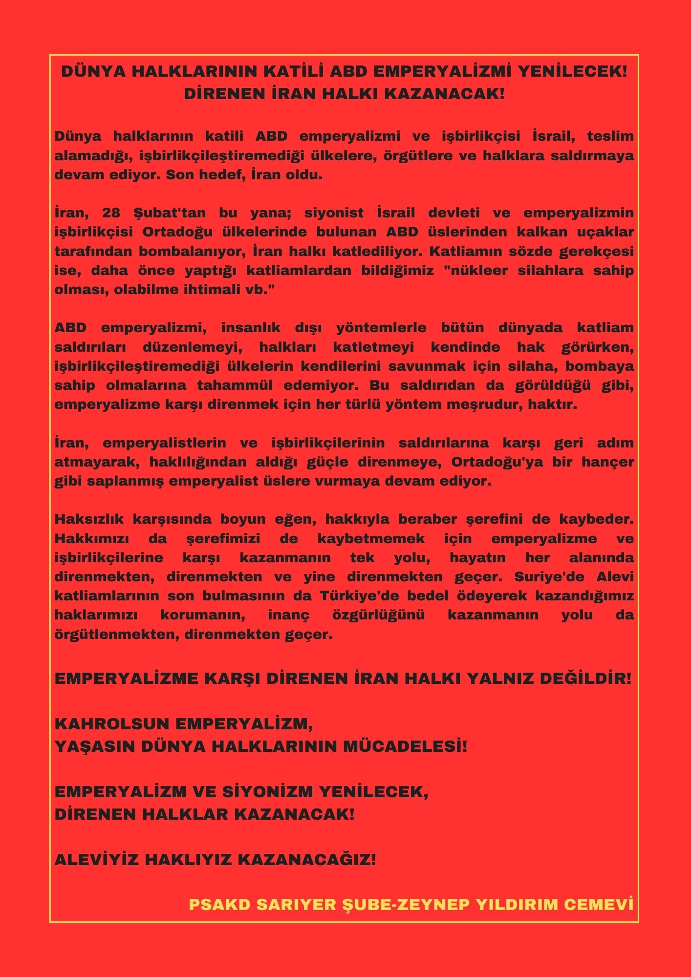 ⌈AHA⌉ PSAKD Sarıyer Şube – Zeynep Yıldırım Cemevi, ABD ve İsrail’in İran’a yönelik saldırılarına ilişkin yazılı bir açıklama yayımladı. Açıklamada, saldırılar sert sözlerle eleştirilirken İran halkıyla dayanışma mesajı verildi.