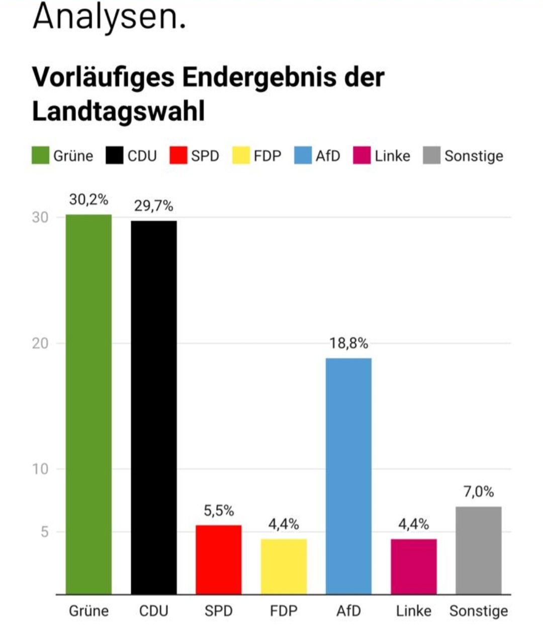 Yapılan değerlendirmede seçimlerde Bündnis 90/Die Grünen’in birinci parti olduğu, ikinci sırada Christlich Demokratische Union (CDU)’nun yer aldığı belirtildi. Oylarını önemli ölçüde artıran Alternative für Deutschland (AfD) ise seçimleri üçüncü sırada tamamladı.