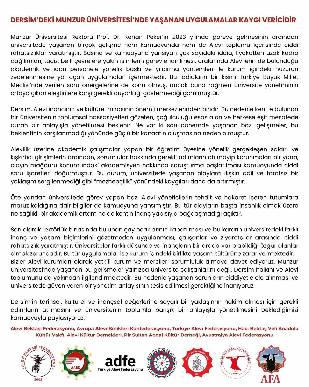 ⌈AHA⌉ Alevi Bektaşi Federasyonu, Avrupa Alevi Birlikleri Konfederasyonu, Türkiye Alevi Federasyonu, Hacı Bektaş Veli Anadolu Kültür Vakfı, Alevi Kültür Dernekleri, Pir Sultan Abdal Kültür Derneği ve Avustralya Alevi Federasyonu, Munzur Üniversitesi’nde son dönemde yaşanan gelişmelere ilişkin ortak bir açıklama yayımladı. Kurumlar, üniversitede yaşanan uygulamaların hem kamuoyunda hem de Alevi toplumu içerisinde ciddi kaygılar yarattığını belirtti.