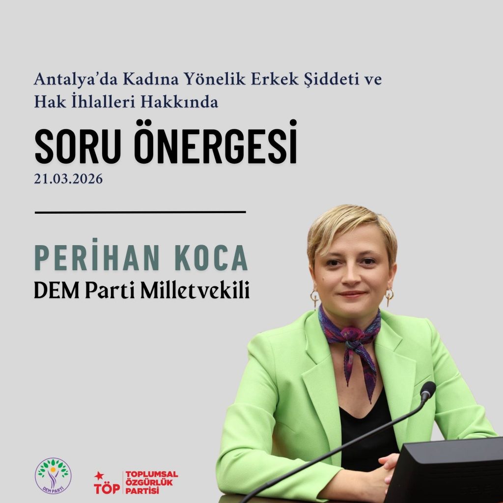 ⌈AHA⌉ DEM Parti Mersin Milletvekili Perihan Koca, Antalya’nın Adrasan bölgesinde yaşanan kadına yönelik şiddet ve hak ihlalleri iddialarını Türkiye Büyük Millet Meclisi gündemine taşıdı. Koca, olayla ilgili soru önergesi vererek yetkililerden açıklama talep etti.
