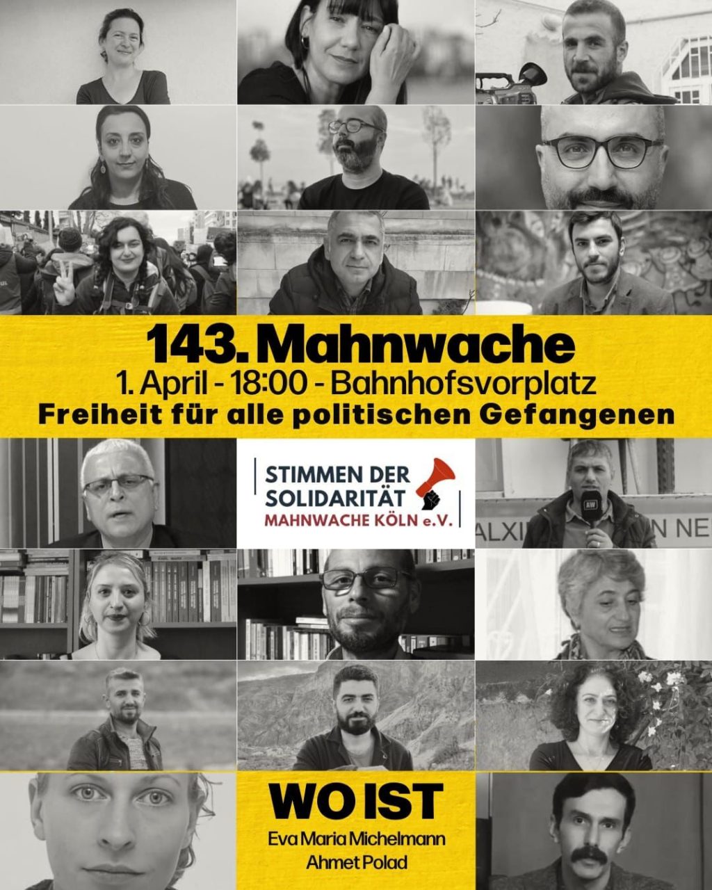 ⌈AHA⌉ Almanya’nın Köln kentinde düzenlenecek 143. Mahnwache (nöbet eylemi) kapsamında, siyasi tutsaklara özgürlük talebi bir kez daha gündeme taşınıyor. “Stimmen der Solidarität – Mahnwache Köln e.V.” tarafından organize edilen eylem, 1 Nisan’da Bahnhofsvorplatz’da gerçekleştirilecek.